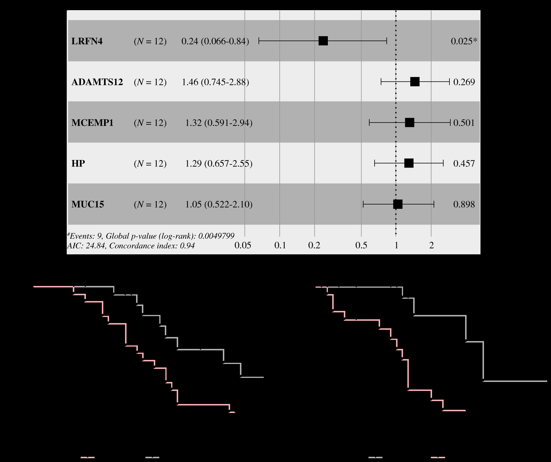 Biomarkers are critical factors in marking and predicting a patient’s prognosis [13]. Leucine rich repeat and fibronectin type III domain containing 4 (LRFN4) is a neuronal transmembrane protein that mainly plays a role in the human immune system. Hu et al. [14] demonstrated that the Treg-related gene LRFN4 is associated with GC prognosis. A disintegrin and metalloproteinase with thrombospondin motifs 12 (ADAMTS12) plays a role in the tumor process mainly through its proteolytic enzyme activity. Hou et al. [15] found that highly expressed ADAMTS12 is mainly enriched in cancer- and immune-related signaling pathways. Mast cell-expressed membrane protein 1 (MCEMP1) is a transmembrane protein expressed by immune-related cells such as mast cells and macrophages. The expression of MCEMP1 is related to the immune infiltration of various immune cells and can be used as a potential prognostic marker for GC [16]. Haptoglobin (HP) is a glycoprotein [17] that affects the innate immune response [18]. It has been found that HP can be used as a marker of glioblastoma [17]. Mucin-15 (MUC15) as an important member of the mucin family belongs to high molecular weight glycoprotein, and it has been demonstrated that MUC15-related genes are enriched in immune-related pathways and can be used as prognostic markers for GC [19]. Treg-related genes (LRFN4, ADAMTS12, MCEMP1, HP, MUC15) are found to be closely related to the prognosis of GC through the TCGA database [14]. The evidence suggests that these five genes exert functions in tumor immunity.