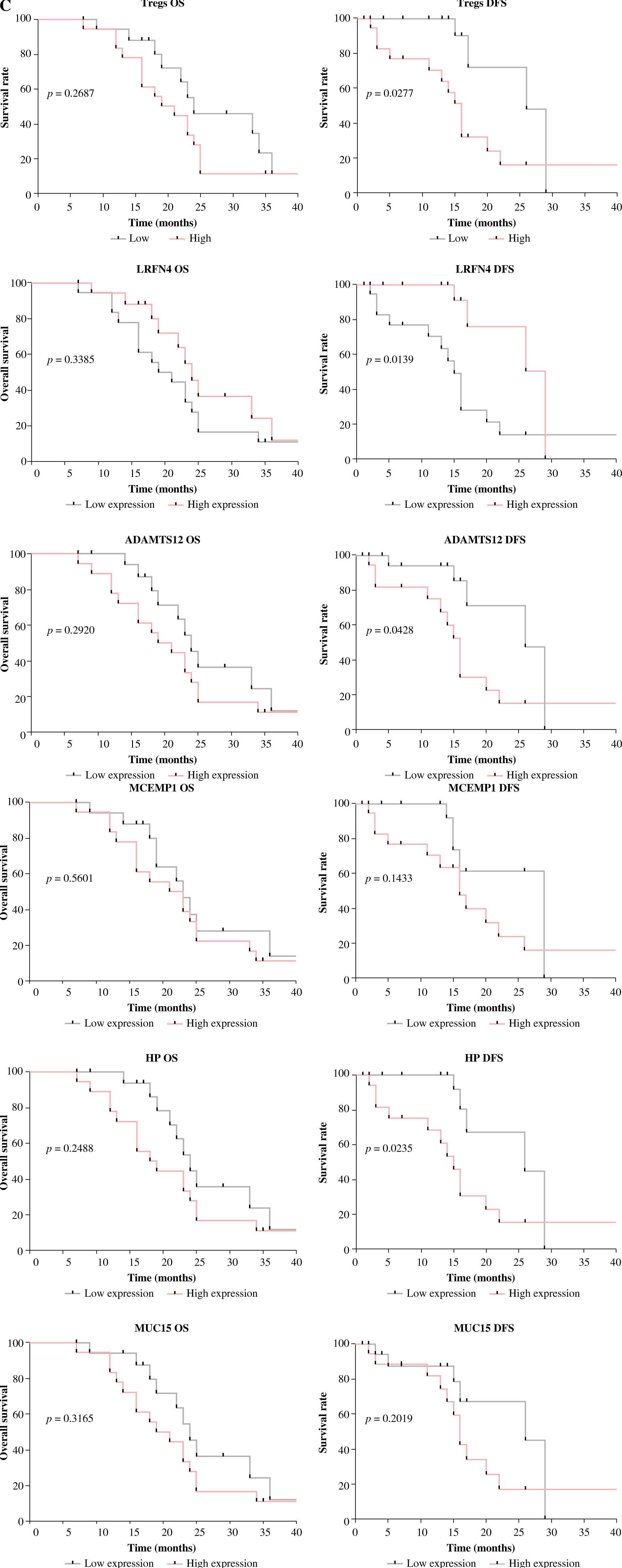 To profile the link between Tregs, Treg-related genes and GC prognosis, we employed Cox regression analysis to build a prognostic model with five Treg-related genes confirmed as prognostic factors (Fig. 3A). Among them, the hazard ratio of LRFN4 stayed below 1, while that of the other four genes was higher than 1. Then, a risk score formula based on the five feature genes was constructed to evaluate the survival risk of the samples according to the expression levels of the five genes: risk score = (1.445558 × LRFN4 expression level) + (0.380839 × ADAMTS12 expression level) + (0.275471 × MCEMP1 expression level) + (0.256952 × HP expression level) + (0.045509 × MUC15 expression level). Based on this established formula, we calculated the score for tumor samples collected from 36 patients. After that, patients were split into high-/low-risk groups by the overall median risk score and followed up for 3 years. As shown in Figure 3B, the low-risk group was found to have notably higher OS and disease-free survival (DFS) (p < 0.05). To analyze the model comprehensively, patients were classified into subgroups by the proportion of Tregs and the median expression level of the five genes. Corresponding survival analyses were plotted by Kaplan-Meier curves (Fig. 3C). According to the results, DFS in the high Tregs group was substantially shorter than that in the low Tregs group. Compared with the corresponding low expression group, the high expression group of LRFN4 had longer DFS, but no significant variation in OS. ADAMTS12 and HP low expression groups had longer DFS. No significant variations were observed in OS and DFS between high and low MCEMP1 and MUC15 expression groups. Although there was no significant correlation between single genes and patients’ OS, the risk score obtained based on these 5 Treg-related genes was significantly correlated with patients’ prognosis (OS and DFS), suggesting that the 5-gene signature might be a prognostic marker for GC patients.
