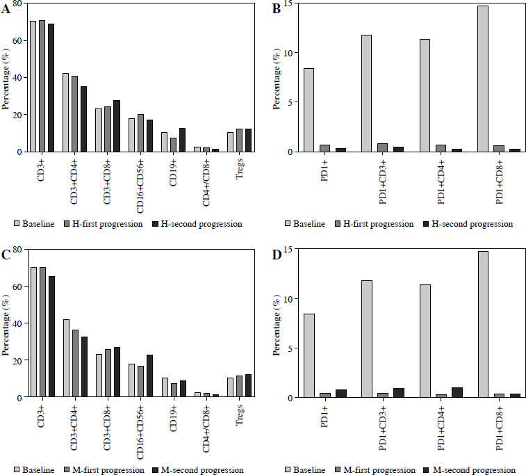 The analysis of intrahepatic and extrahepatic progression showed that most patients had disease progression within one year after combination therapy, and the lymph nodes were the most common site of metastasis, which correlated with systemic immune regulation [16]. Therefore, the changing patterns of peripheral blood immune cells were analyzed. There were three subgroups in this analysis: the time point of baseline (n = 19), the time points of first progression in intrahepatic (H-first progression, n = 29) and extrahepatic progression (M-first progression, n = 18), and the time points of second progression in intrahepatic (H-second progression, n = 17) and extrahepatic progression (M-second progression, n = 18). The results showed different trends in the changes of CD3+ T cells, CD3+CD4+ T cells, CD3+CD8+ T cells, and CD16+CD56+ cells between cases of intrahepatic and extrahepatic progression (Fig. 3A, C) and a gradual decrease in the percentages of PD1+ cells, PD1+CD3+ T cells, PD1+CD4+ T cells and PD1+CD8+ T cells following combination therapy, which gradually increased during the follow-up in cases of extrahepatic progression (Fig. 3B, D).