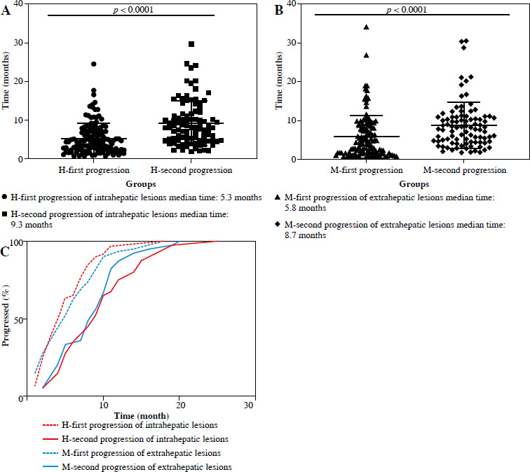 To investigate the impact of the combination therapy on disease progression, the median time to disease progression in intrahepatic and extrahepatic lesions was compared. During the analysis of intrahepatic progression, 26 of 86 patients (30.2%) did not show intrahepatic progression after combination therapy, whereas 60 of 86 patients (69.8%) showed first progression. Secondary progression was observed in 40 of 60 patients (66.7%). The median time to first progression (H-first progression) was 5.3 months for all 60 patients (95% CI: 2.3-7.1 months, Fig. 1A). The median time to second progression (H-second progression) was 9.3 months in all 40 patients (95% CI: 4.8-11.8 months, Fig. 1A).