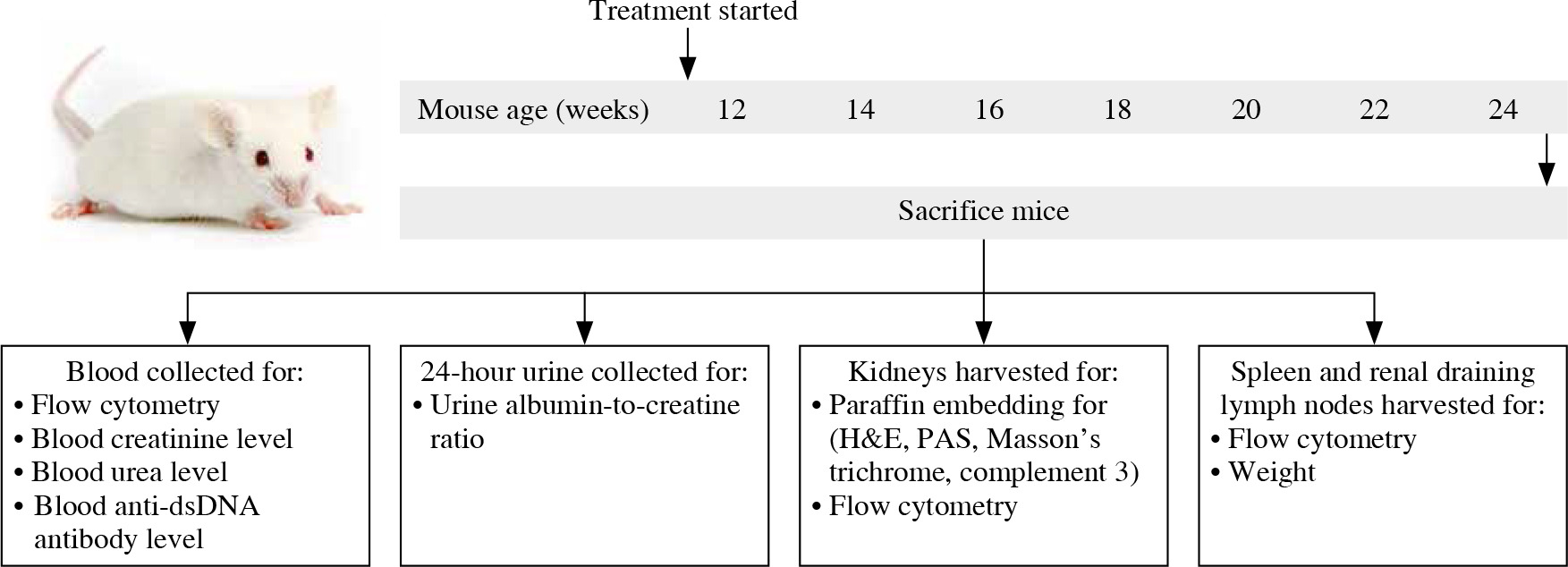 Schematic diagram showing treatment, sample collection, and studies conducted in MRL/lpr mice. 12-week-old female MRL/lpr mice were randomized to receive phosphate-buffered saline (PBS) or rapamycin for up to 12 weeks. Mice were killed and peripheral blood, urine, kidneys, spleens, and renal draining lymph nodes were collected for assessment of clinical, serological, histological, and immunological parameters of disease, with particular focus on Treg cells and TIM-3 expression