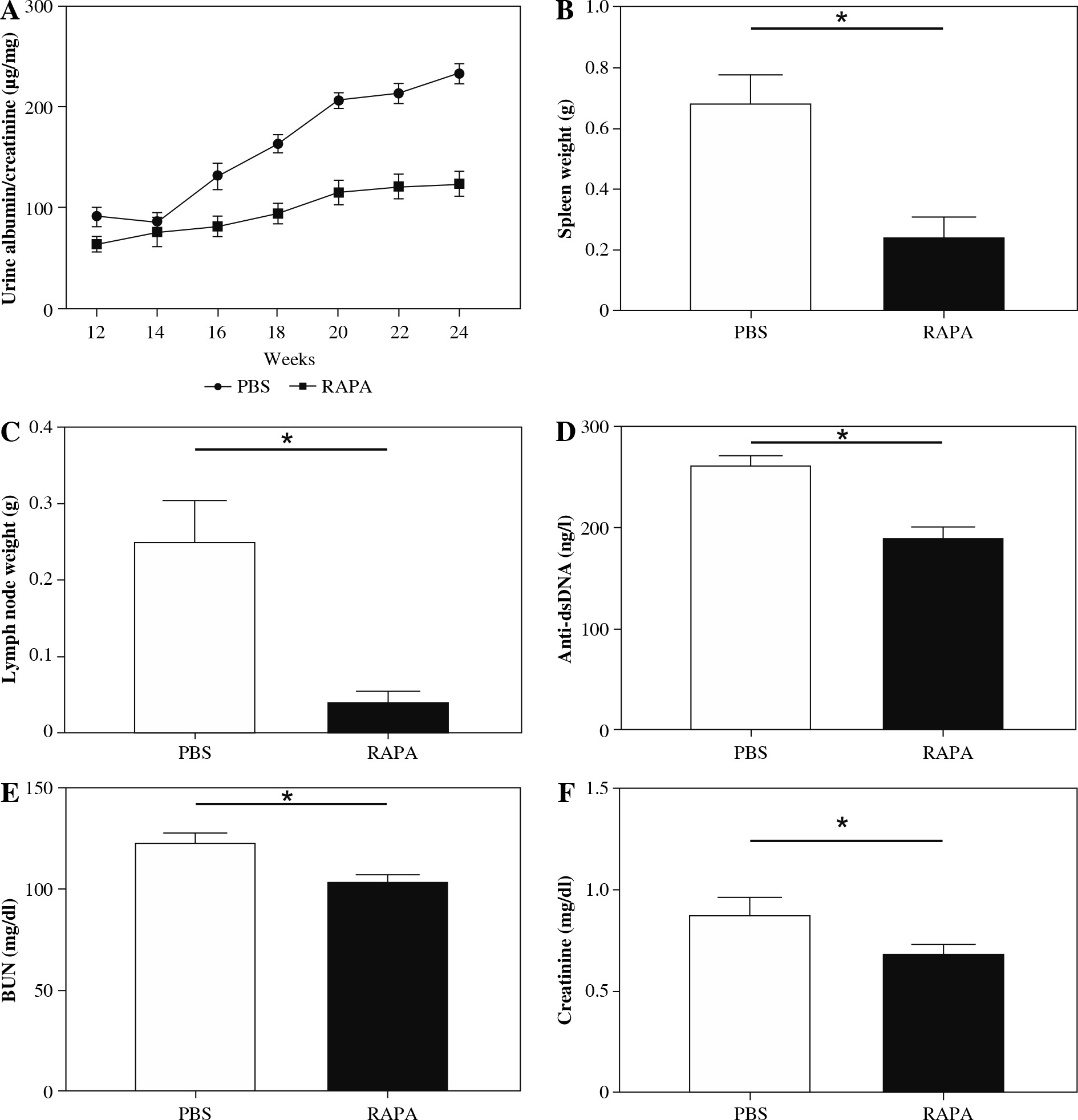 The effect of rapamycin on clinical and serological parameters in MRL/lpr mice. The effect of phosphate-buffered saline (PBS) or rapamycin treatment on: A) urine albumin-to-creatinine ratio, B) spleen weight, C) renal draining lymph node weight, D) circulating anti-dsDNA antibody titer, E) BUN level, F) blood creatinine level in MRL/lpr mice. Data expressed as mean ± SEM (n = 6 mice per group); *p < 0.05, dsDNA – double-stranded DNA, BUN – urea nitrogen
