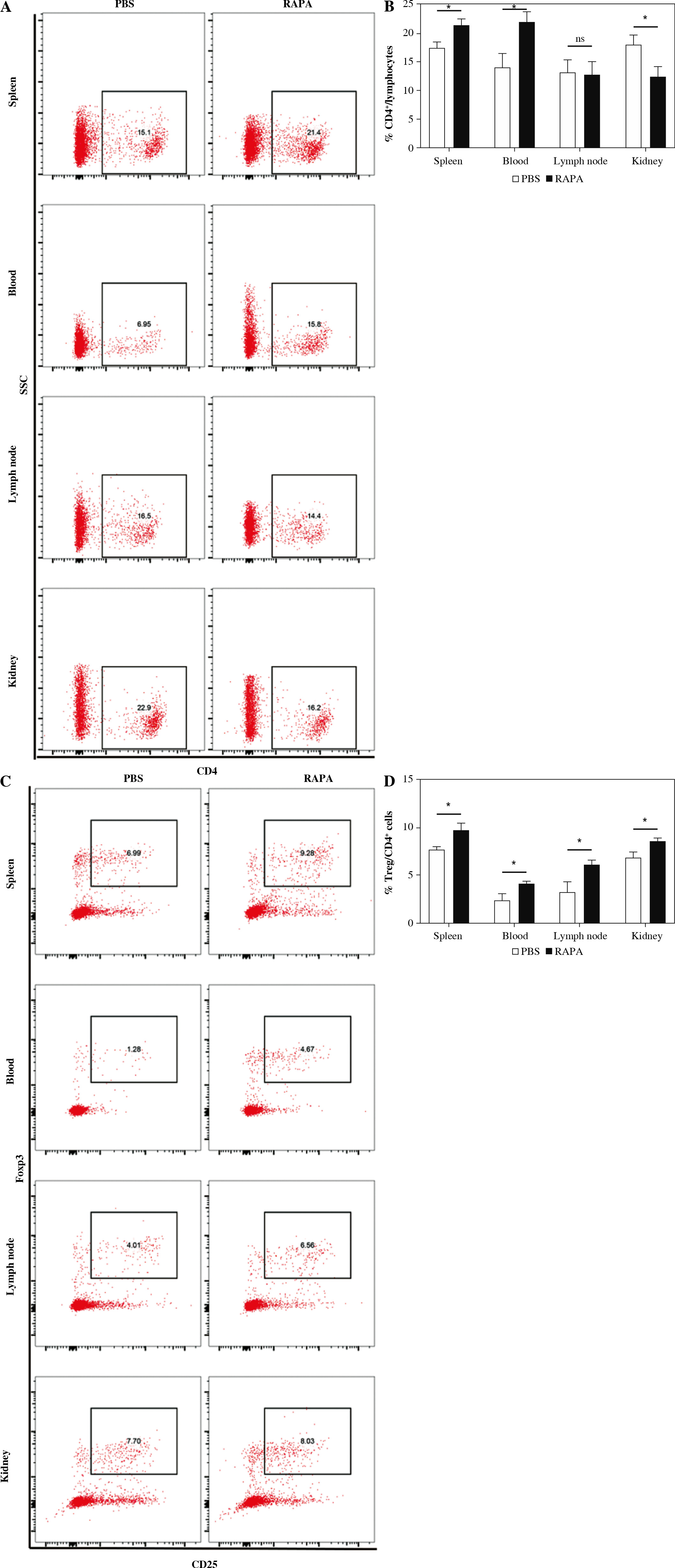 The effect of rapamycin on CD4+ T cells and CD4+CD25+Foxp3+ Treg cells. A, C) Representative flow cytometric dot plots of CD4+ T cells and CD4+CD25+Foxp3+ Treg cells in the phosphate-buffered saline (PBS) or rapamycin-treated mice. B, D) Percentage of CD4+ T cells and Treg cells in the spleen, peripheral blood, renal draining lymph node, and kidney in the PBS therapy group and rapamycin therapy group (n = 6 mice per group). Graphs show the mean ± SEM and *p < 0.05 A, C) Representative flow cytometric dot plots of CD4+ T cells and CD4+CD25+Foxp3+ Treg cells in the phosphate-buffered saline (PBS) or rapamycin-treated mice. B, D) Percentage of CD4+ T cells and Treg cells in the spleen, peripheral blood, renal draining lymph node, and kidney in the PBS therapy group and rapamycin therapy group (n = 6 mice per group). Graphs show the mean ± SEM and *p < 0.05