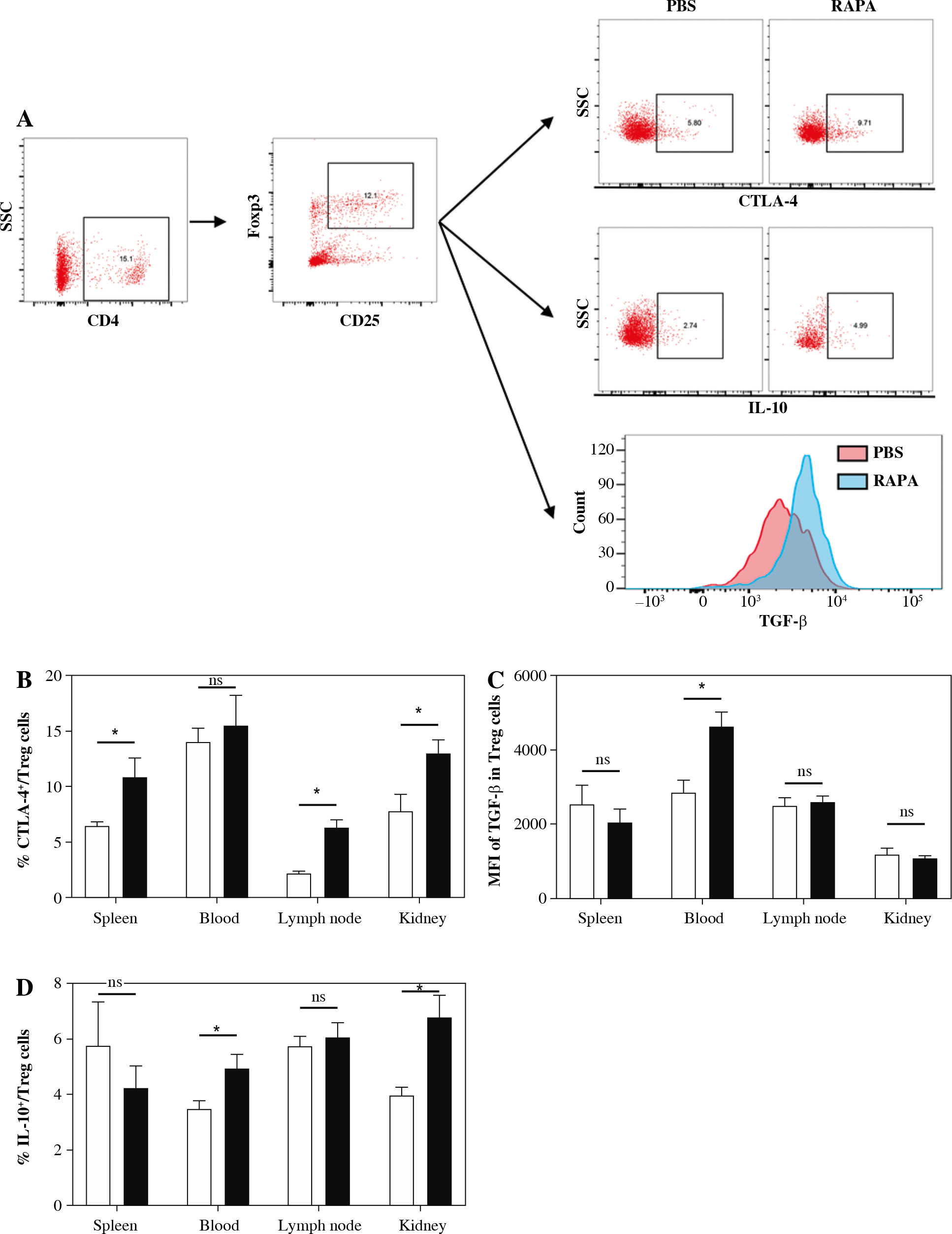The impact of rapamycin on CTLA-4, TGF-β1, and IL-10 production in CD4+CD25+Foxp3+ Treg cells. A) Representative flow cytometric dot plots for CTLA-4+ cells, IL-10+ cells and histogram for TGF-β1+ cells gated from CD4+CD25+Foxp3+ Treg cell population. B) Percentage of CTLA-4+ cells expressed in spleen, peripheral blood, renal draining lymph node and kidney in the PBS or rapamycin-treated mice. C) MFI of TGF-β1 in Treg population in each group. D) Percentage of IL-10+ cells in Treg population in each group. Graphs show the mean ± SEM (n = 6 mice per group) and *p < 0.05