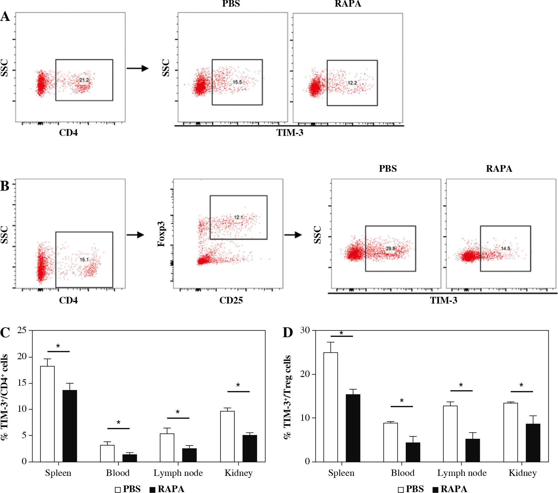 To examine the effect of rapamycin on TIM-3 signaling, the expression of TIM-3 in CD4+ T cells and CD4+ CD25+Foxp3+ Treg cells was detected. As shown in Figure 6, TIM-3 was significantly reduced in the rapamycin treatment group compared with the control in the spleen, peripheral blood, renal draining lymph node, and kidney. Moreover, the expression of TIM-3 was significantly decreased in CD4+CD25+Foxp3+ Treg cells in the spleen, peripheral blood, renal draining lymph node, and kidney of mice treated with rapamycin. The results indicated that rapamycin-mediated protective actions involve TIM-3.