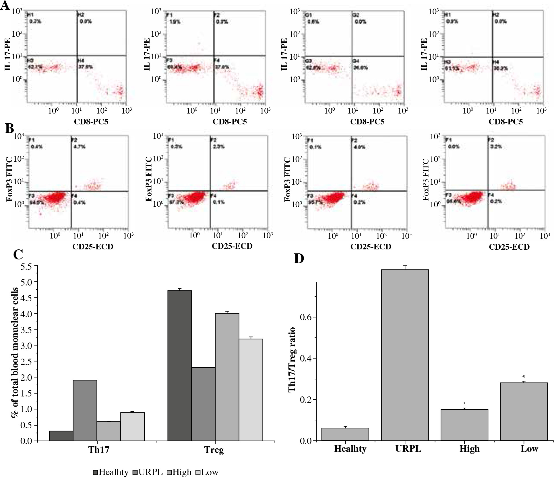 The related pathogenesis of URPL remains unknown [7]. However, it has been suggested that cytokines produced by CD4+ T cells may play an important role in the cause of URPL [8]. The CD4+ T cells can be classified into the following subsets: T helper (Th)1, Th2, Th17 and regulatory T (Treg) cells according to their functions. Several studies have reported that the altered immunity in URPL is dominated by the Th1/Th2 hypothesis. They found that the Th1/Th2 ratio were higher in URPL patients compared to normal pregnant controls, which indicates that the changes in the proportion of Th1 and Th2 may be related to occurrence of URPL [9, 10]. However, the emerging concept of the Th17/Treg balance has challenged the conventional paradigm of Th1/Th2 hypothesis. Accumulating evidence suggests that Th17 and Treg cells play the antagonist roles on the URPL [11-14], they proposed the increase of the Th17/Treg ratio as a cause for URPL.