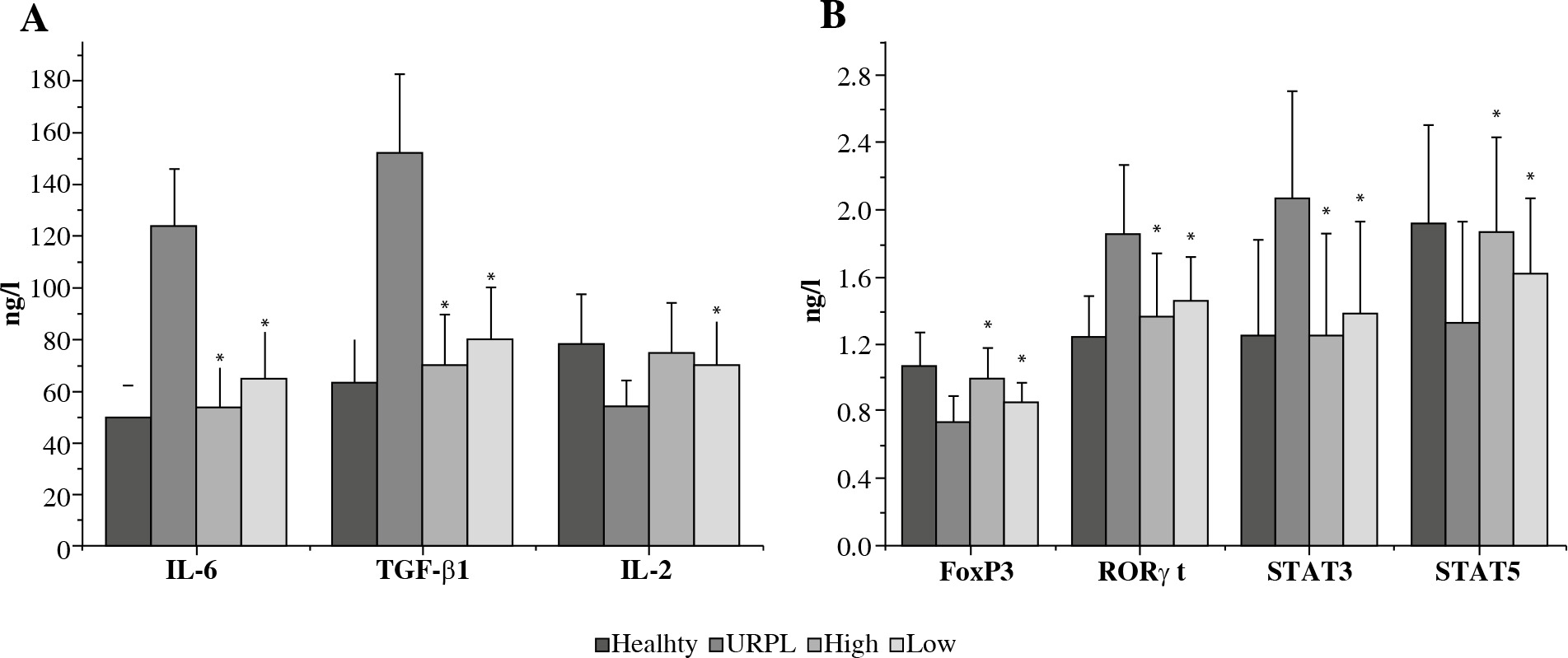 The levels of IL-6, IL-2, TGF-β1 and FoxP3, RORγt, STAT3, STAT5 in four groups