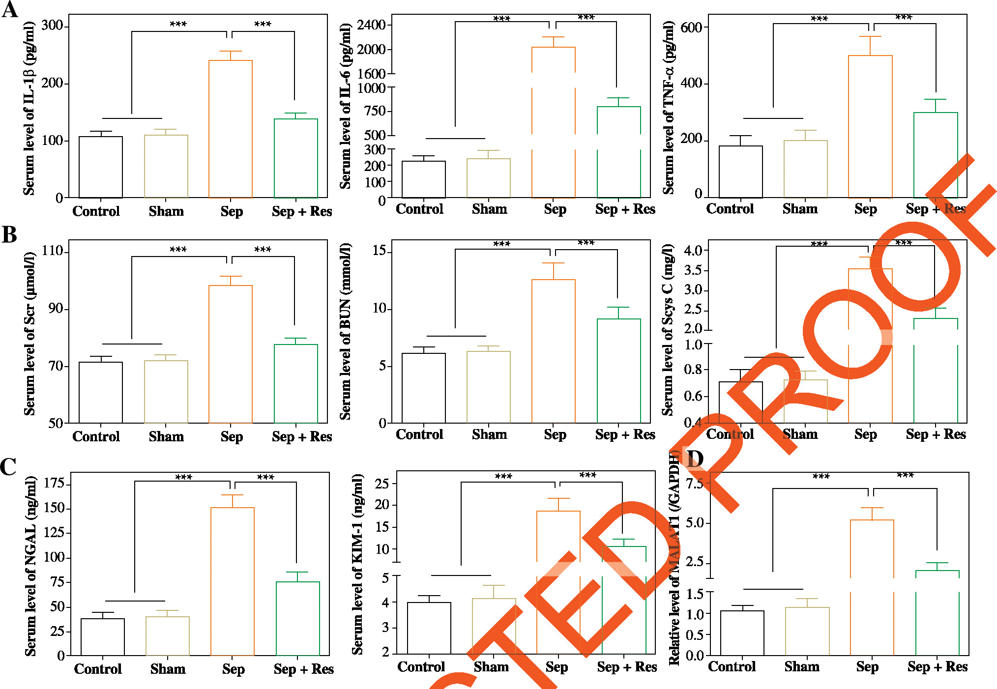 Rats of the Sep group had significantly higher serum levels of TNF-α, IL-1β and IL-6 than rats of the Sham group (all p < 0.001), and levels of the cytokines were significantly lower in the Sep + Res group as compared with the Sep group (all p < 0.001) (Fig. 1A). In addition, Scr, BUN and Scys C levels, suggestive of renal function [29], were markedly raised in septic model rats as compared to rats of the Sham group (all p < 0.001), yet administration of resveratrol (i.e. Rep group) significantly reduced Scr, BUN and Scys C levels in comparison to the Sep group (all p < 0.001) (Fig. 1B). When compared with rats of the Sham group, NGAL and KIM-1 levels, pivotal indicators of AKI [30], were increased in septic model rats (all p < 0.001), while resveratrol treatment (i.e. Rep group) mitigated AKI injuries in septic rats (all p < 0.001) (Fig. 1C). Moreover, serum level of MALAT1 was raised in model rats of Sep group (all p < 0.001), but it fell markedly in the Sep + Res group as compared with Sep group (all p < 0.001) (Fig. 1D).