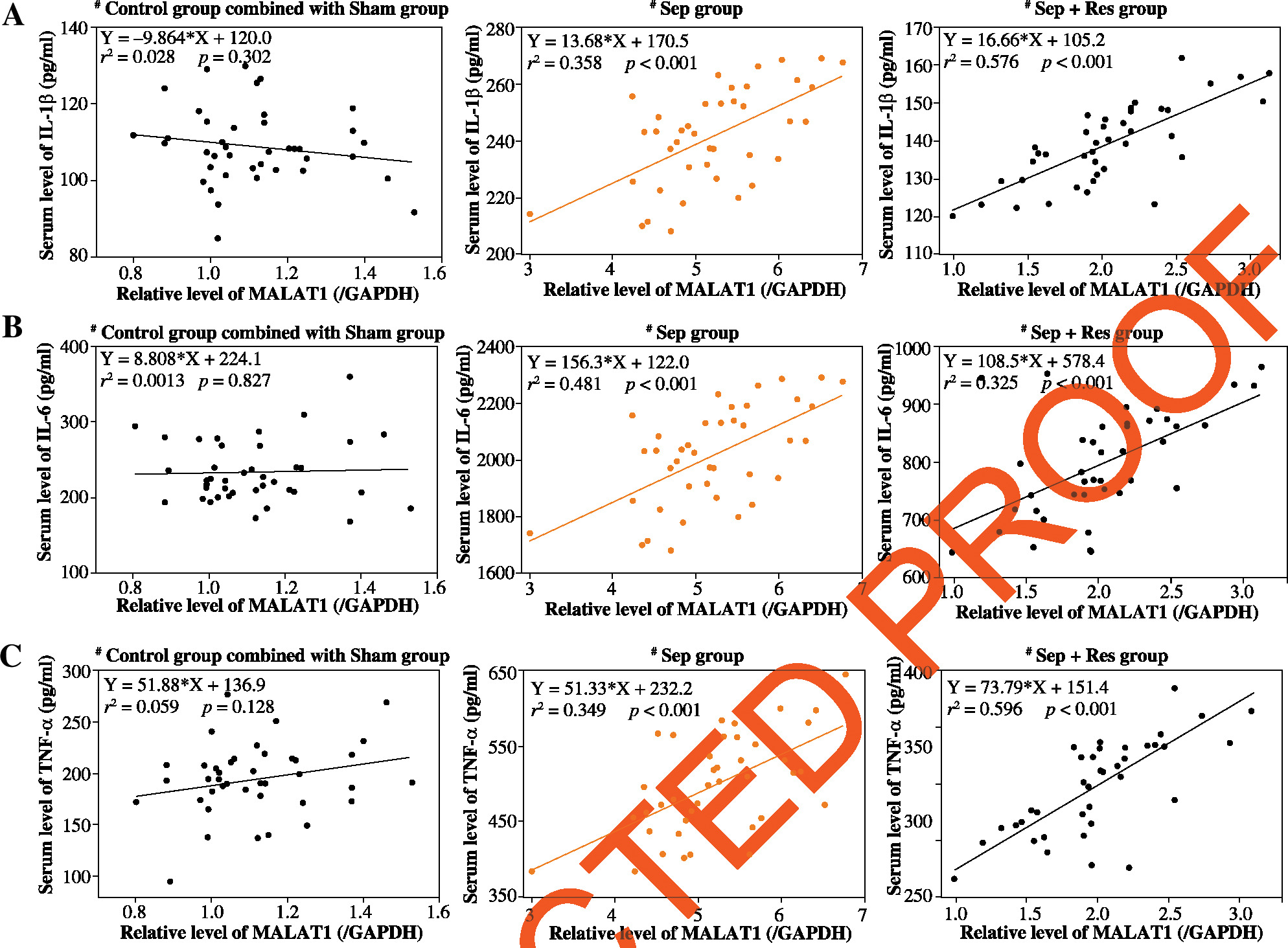 LncRNA MALAT1 level was correlated with serum levels of IL-1β (A), IL-6 (B) and TNF-α (C) among rats of control group combined with Sham group combined, Sep group and Sep + Res group