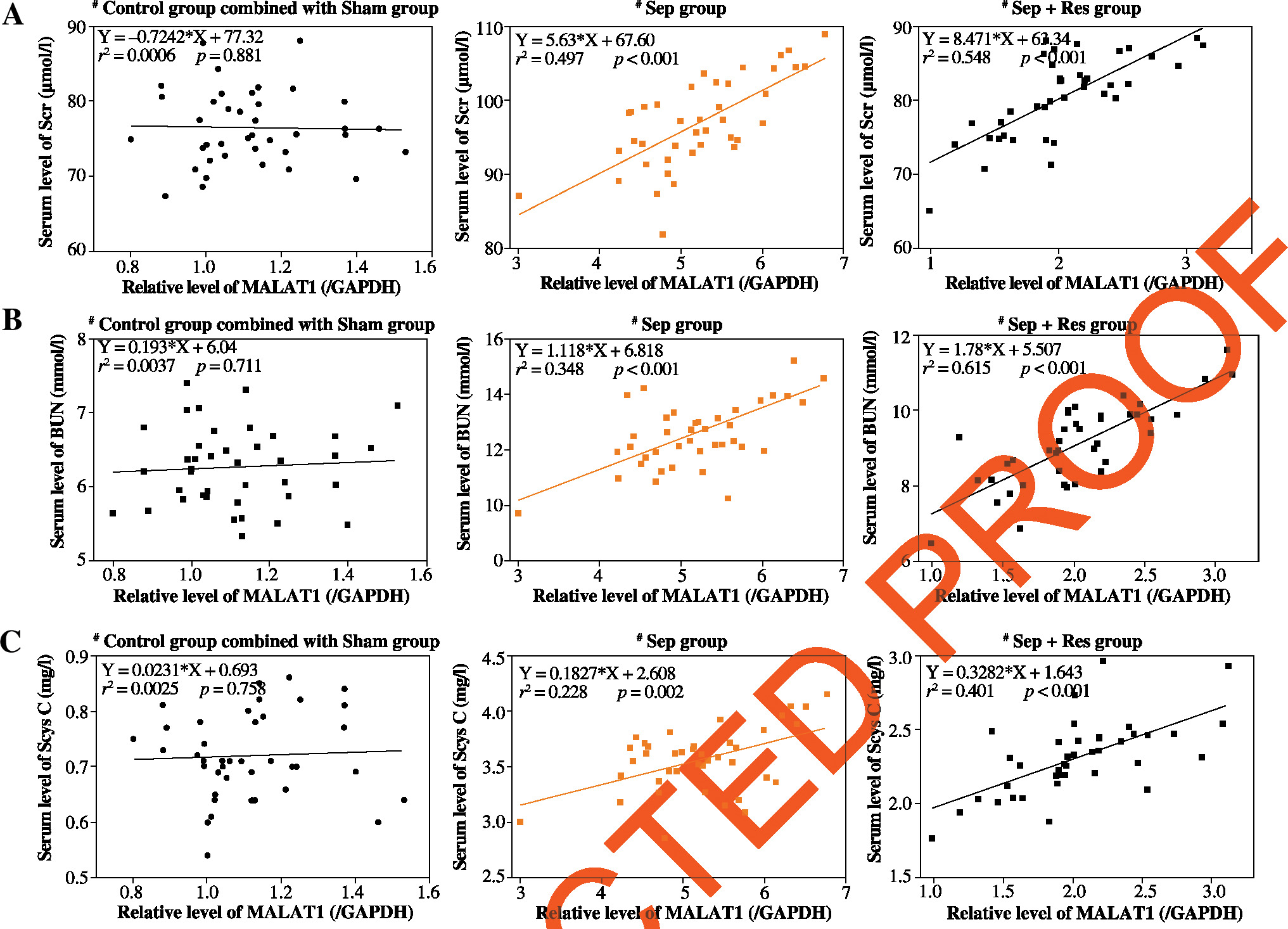 MALAT1 level was positively correlated with serum levels of IL-1β (Fig. 2A), IL-6 (Fig. 2B) and TNF-α (Fig. 2C) in model rats of sepsis group (IL-1β: rs = 0.358, p < 0.001; IL-6: rs = 0.481, p < 0.001; TNF-α: r2 = 0.349, p < 0.001) and Sep + Res group (IL-1β: r2 = 0.576, p < 0.001; IL-6: r2 = 0.325, p < 0.001; TNF-α: r2 = 0.596, p < 0.001). There were also pronounced correlations between MALAT1 level and levels of Scr (Fig. 3A), BUN (Fig. 3B) and Scys C (Fig. 3C) among rats of sepsis group (Scr: r2 = 0.497, p < 0.001; BUN: r2 = 0.348, p < 0.001; Scys C: r2 = 0.228, p = 0.002) and rats of Sep + Res group (Scr: r2 = 0.548, p < 0.001; BUN: r2 = 0.615, p < 0.001; Scys C: r2 = 0.401, p < 0.001). Furthermore, MALAT1 level rose significantly as NGAL (Fig. 4A) and KIM-1 (Fig. 4B) levels were elevated in model rats of the sepsis group (NGAL: rs = 0.421, p < 0.001; KIM-1: rs = 0.484, p < 0.001) and Sep + Res group (NGAL: rs = 0.613, p < 0.001; KIM-1: rs = 0.577, p < 0.001). Nonetheless, hardly any significance was discerned in the correlation between serum level of MALAT1 and serum level of IL-1β (p = 0.302), IL-6 (p = 0.827), TNF-α (p = 0.128), Scr (p = 0.881), BUN (p = 0.711), Scys C (p = 0.758), NGAL (p = 0.492) or KIM-1 (p = 0.402) (Figs. 2-4).