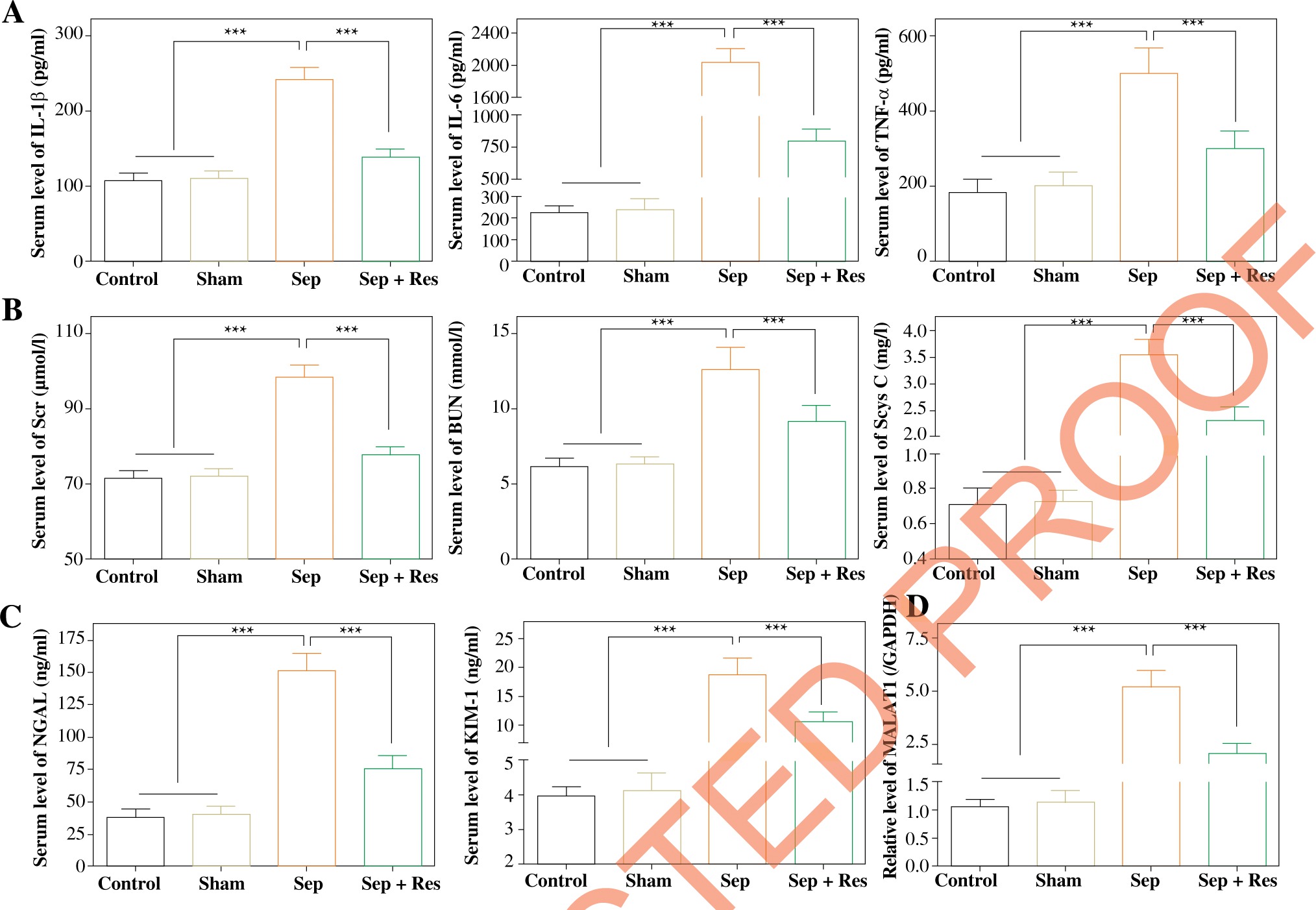 Rats of the Sep group had significantly higher serum levels of TNF-α, IL-1β and IL-6 than rats of the Sham group (all p < 0.001), and levels of the cytokines were significantly lower in the Sep + Res group as compared with the Sep group (all p < 0.001) (Fig. 1A). In addition, Scr, BUN and Scys C levels, suggestive of renal function [29], were markedly raised in septic model rats as compared to rats of the Sham group (all p < 0.001), yet administration of resveratrol (i.e. Rep group) significantly reduced Scr, BUN and Scys C levels in comparison to the Sep group (all p < 0.001) (Fig. 1B). When compared with rats of the Sham group, NGAL and KIM-1 levels, pivotal indicators of AKI [30], were increased in septic model rats (all p < 0.001), while resveratrol treatment (i.e. Rep group) mitigated AKI injuries in septic rats (all p < 0.001) (Fig. 1C). Moreover, serum level of MALAT1 was raised in model rats of Sep group (all p < 0.001), but it fell markedly in the Sep + Res group as compared with Sep group (all p < 0.001) (Fig. 1D).