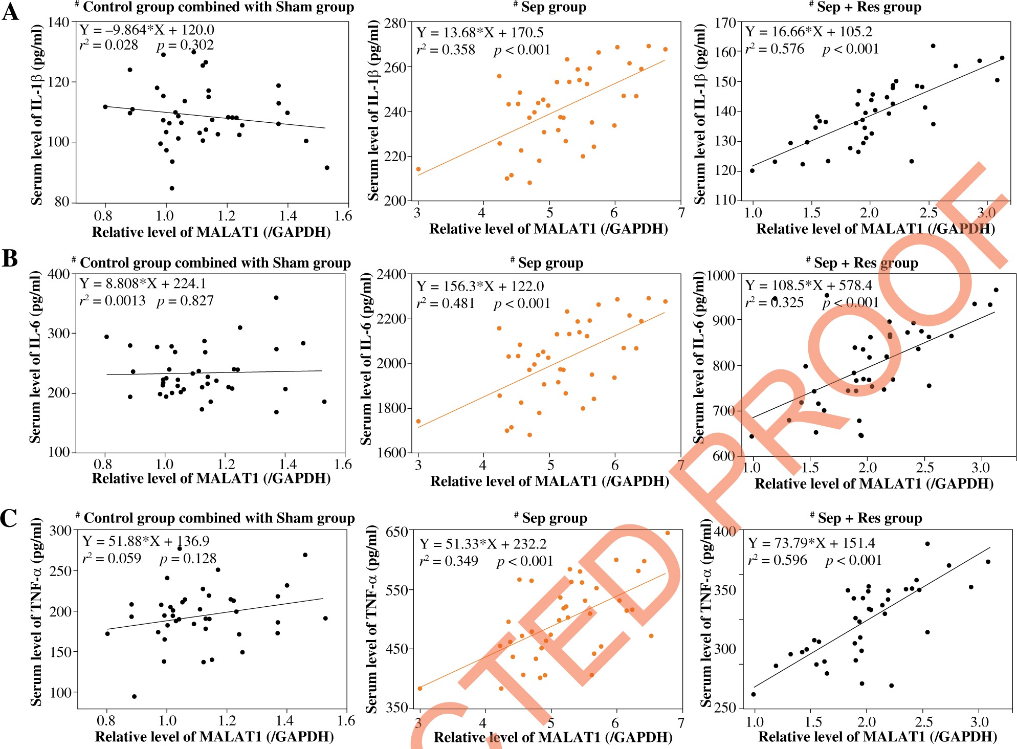 LncRNA MALAT1 level was correlated with serum levels of IL-1β (A), IL-6 (B) and TNF-α (C) among rats of control group combined with Sham group combined, Sep group and Sep + Res group