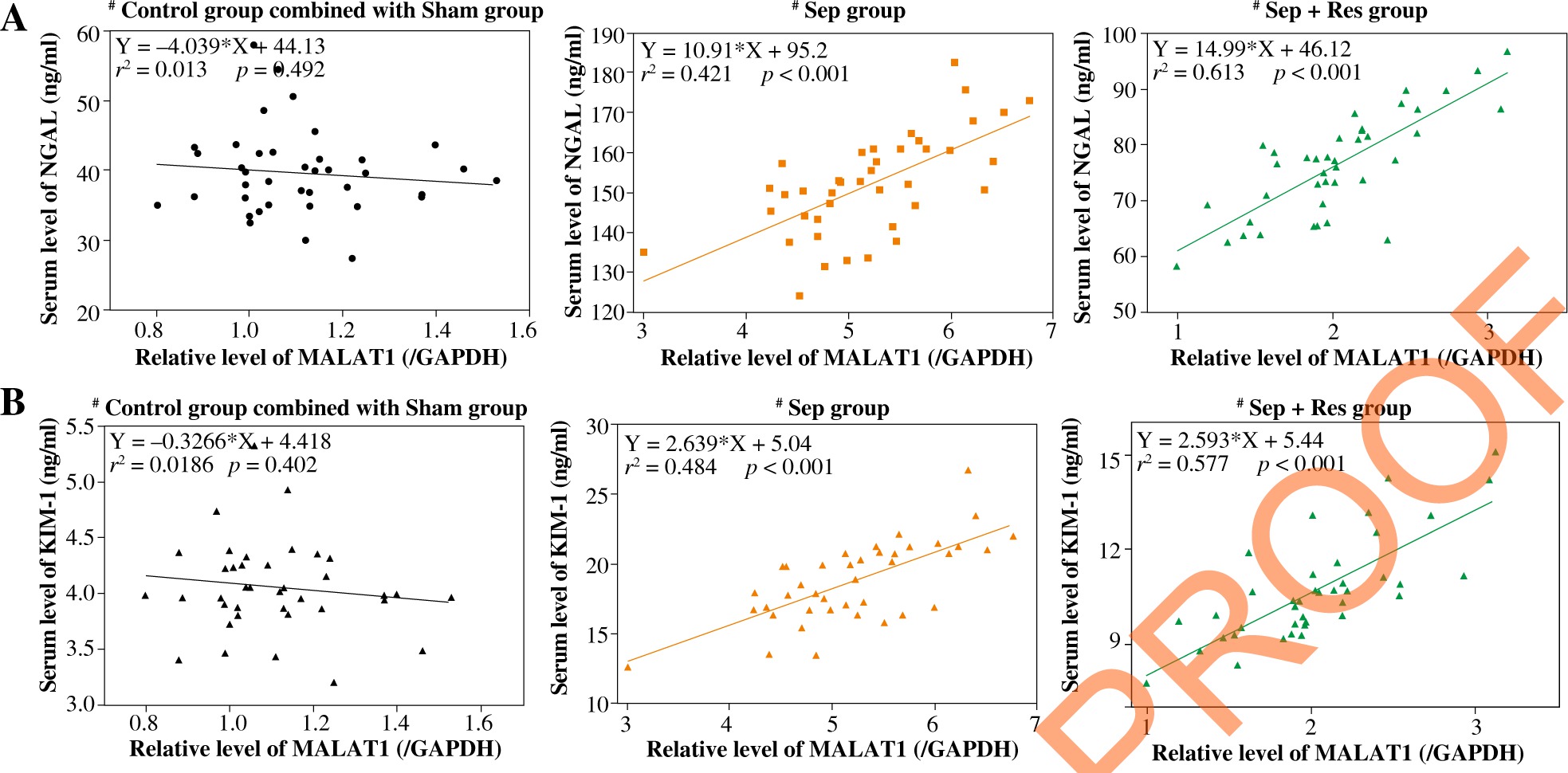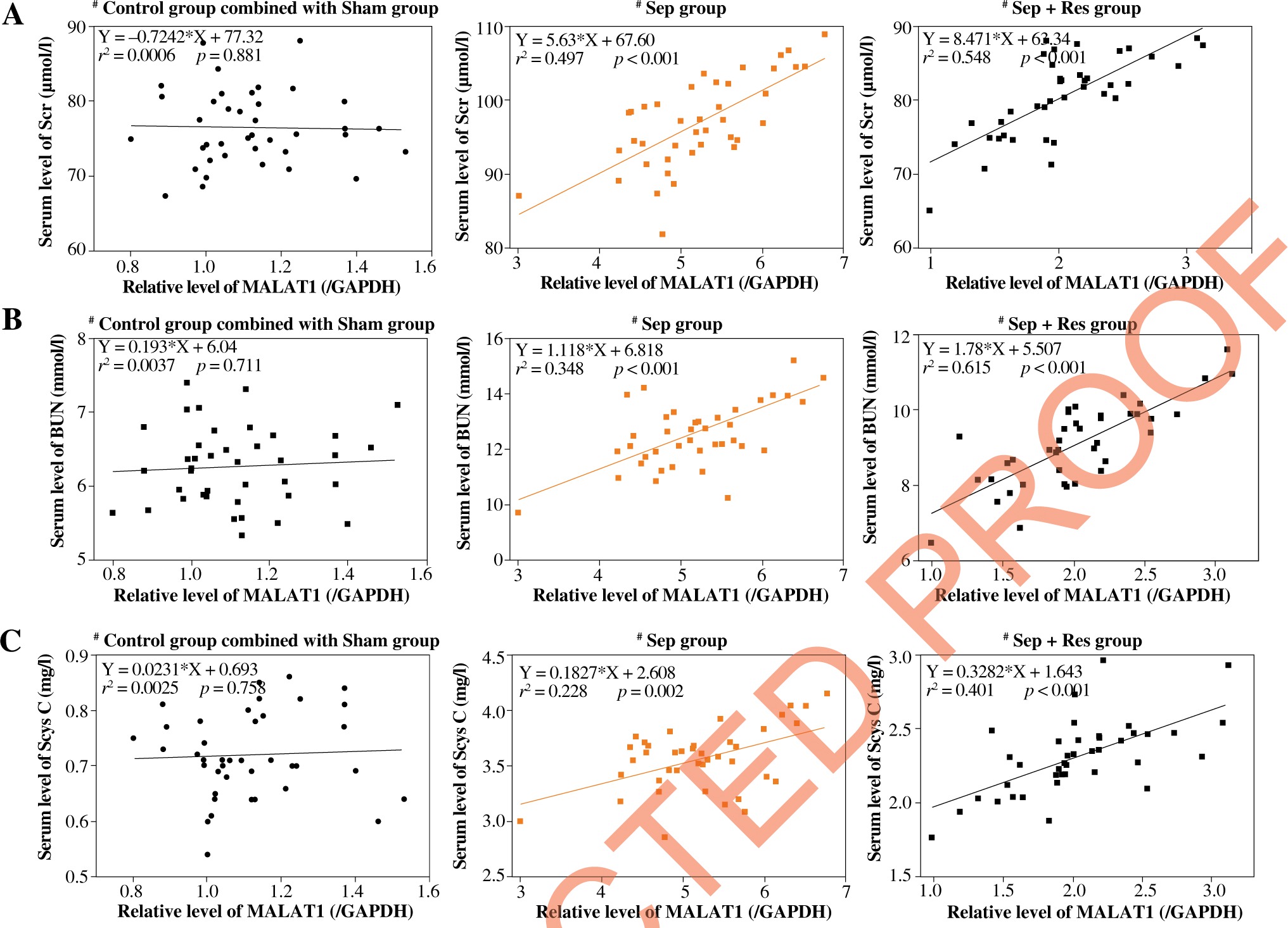 MALAT1 level was positively correlated with serum levels of IL-1β (Fig. 2A), IL-6 (Fig. 2B) and TNF-α (Fig. 2C) in model rats of sepsis group (IL-1β: rs = 0.358, p < 0.001; IL-6: rs = 0.481, p < 0.001; TNF-α: r2 = 0.349, p < 0.001) and Sep + Res group (IL-1β: r2 = 0.576, p < 0.001; IL-6: r2 = 0.325, p < 0.001; TNF-α: r2 = 0.596, p < 0.001). There were also pronounced correlations between MALAT1 level and levels of Scr (Fig. 3A), BUN (Fig. 3B) and Scys C (Fig. 3C) among rats of sepsis group (Scr: r2 = 0.497, p < 0.001; BUN: r2 = 0.348, p < 0.001; Scys C: r2 = 0.228, p = 0.002) and rats of Sep + Res group (Scr: r2 = 0.548, p < 0.001; BUN: r2 = 0.615, p < 0.001; Scys C: r2 = 0.401, p < 0.001). Furthermore, MALAT1 level rose significantly as NGAL (Fig. 4A) and KIM-1 (Fig. 4B) levels were elevated in model rats of the sepsis group (NGAL: rs = 0.421, p < 0.001; KIM-1: rs = 0.484, p < 0.001) and Sep + Res group (NGAL: rs = 0.613, p < 0.001; KIM-1: rs = 0.577, p < 0.001). Nonetheless, hardly any significance was discerned in the correlation between serum level of MALAT1 and serum level of IL-1β (p = 0.302), IL-6 (p = 0.827), TNF-α (p = 0.128), Scr (p = 0.881), BUN (p = 0.711), Scys C (p = 0.758), NGAL (p = 0.492) or KIM-1 (p = 0.402) (Figs. 2-4).