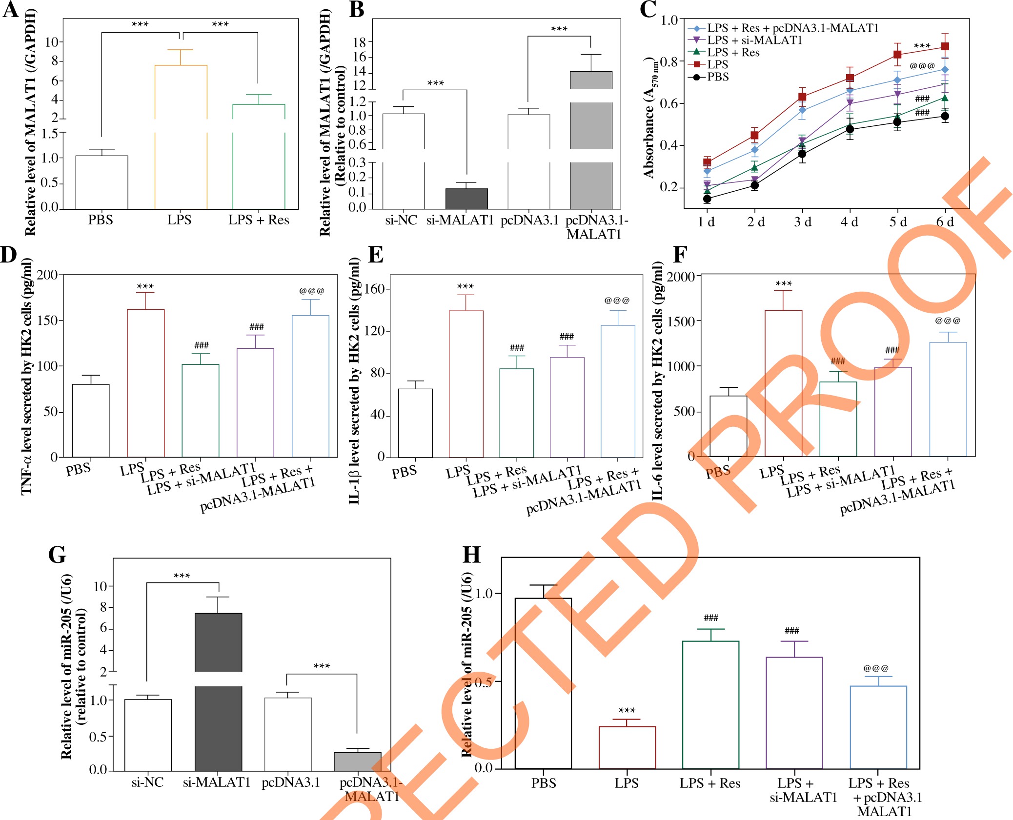 Viability of HK2 cells was strengthened after stimulation of LPS, when compared with the control group (p < 0.001) (Fig. 6C). Both resveratrol and si-MALAT1 were capable of undermining viability of LPS-treated HK2 cells (p < 0.001), although resveratrol played a stronger restraining role than si-MALAT1 (p < 0.001). Also the suppressive effect of resveratrol (i.e. LPS + resveratrol group) on viability of LPS-treated HK2 cells could be alleviated by pcDNA3.1-MALAT1 (i.e. LPS + resveratrol + pcDNA3.1-MALAT1 group) (p < 0.001).
