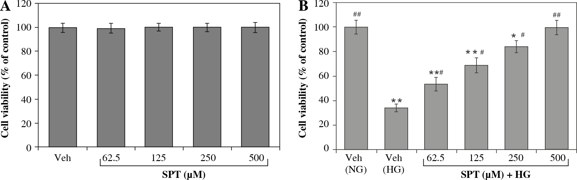 The investigation reported herewith demonstrates protective efficiency of SPT during oxidative stress triggered in RGC-5 cells under a high-glucose environment by regulation of MMP (ΔYm), c-JNK and p38 MAPK, and suppressing the oxidative stress markers.