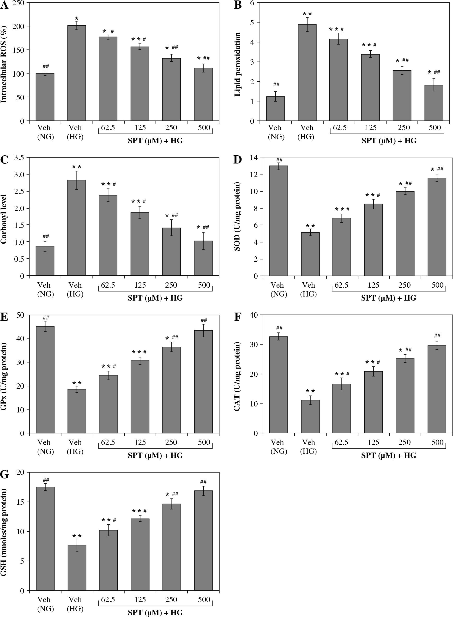 SPT treatment normalized the reactive oxygen species (ROS) production, lipid peroxidation, protein carbonylation, and endogenous antioxidant defense in RGC-5 cells subjected to high-glucose concentration challenge. A) ROS levels, B) lipid peroxidation levels, C) total protein carbonyl content, and D) superoxide dismutase (SOD) levels, E) glutathione peroxidase (GPx) levels, F) catalase (CAT) levels, and G) glutathione (GSH) levels. The RGC-5 cells were cultured with normal (NG) or high glucose (HG) plus SPT at concentrations of 62.5, 125, 250, and 500 mM for 48 h. The experiments were performed in triplicate and data are presented as mean ± SD of five independent experiments (n = 5). *p < 0.05 and **p < 0.01 when compared with the normal-glucose vehicle (Veh)-treated group. #p < 0.05 and ##p < 0.01 when compared with the high-glucose vehicle-treated group
