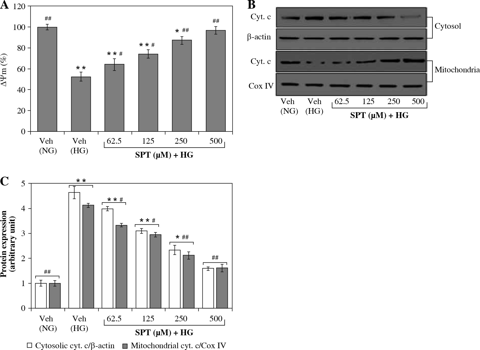 SPT corrected the mitochondrial functionality of RGC-5 cells exposed to high glucose concentration. The RGC-5 cells were cultured with normal (NG) or high glucose (HG) plus SPT at concentrations of 62.5, 125, 250, and 500 mM for 48 h. A) Effects of treatments on high glucose-induced reduction of mitochondrial membrane potential (ΔYm); B) Effects of SPT treatment on high glucose- induced release of cytochrome c (cyt. c) from mitochondria. The experiments were performed in triplicate and data are presented as the mean ± SD of five independent experiments (n = 5). *p < 0.05 and **p < 0.01 when compared with the normal-glucose vehicle (Veh)-treated group. #p < 0.05 and ##p < 0.01 when compared with the high-glucose vehicle-treated group