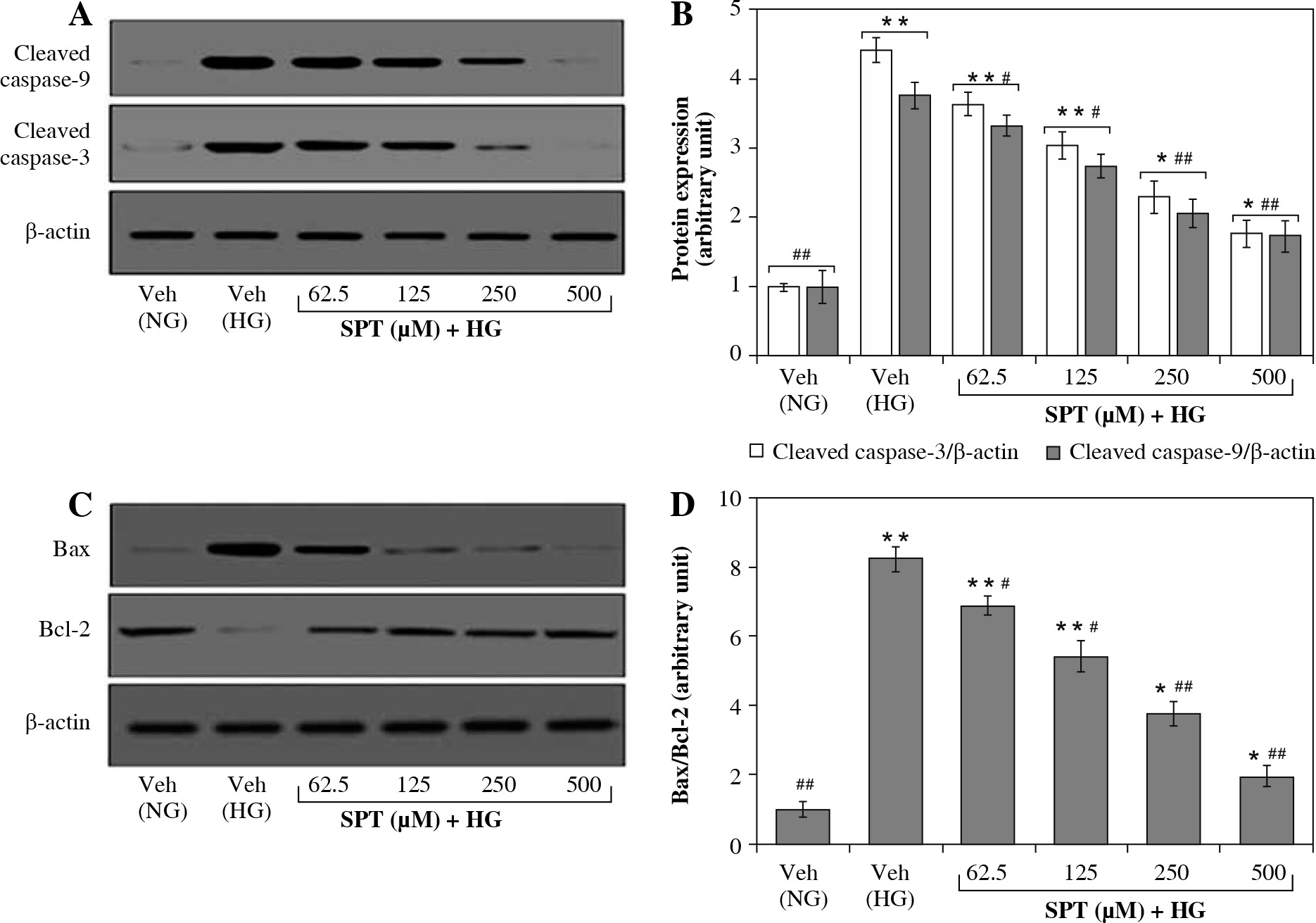 SPT lowered the expression of cleaved caspase-3, cleaved capsase-9 protein and Bax/Bcl-2 ratio in RGC-5 cells exposed to high glucose concentration. The RGCs were cultured with normal (NG) or high glucose (HG) plus SPT at concentrations of 62.5, 125, 250, and 500 mM for 48 h. A) Protein bands of cleaved caspase-9 and cleaved caspase-3 in RGC-5 cells detected by Western blotting; B) Quantitative densitometric analysis of caspase-9 and cleaved caspase-3; C) Protein bands of Bax and Bcl-2 in RGC-5 cells detected by Western blotting; D) Changes of the ratios of Bax/Bcl-2 are displayed in the bottom panel. The results are presented as the mean ± SD of five independent experiments (n = 5), each of which was performed in triplicate. *p < 0.05 and **p < 0.01 when compared with the normal-glucose vehicle (Veh)-treated group. #p < 0.05 and ##p < 0.01 when compared with the high-glucose vehicle-treated group