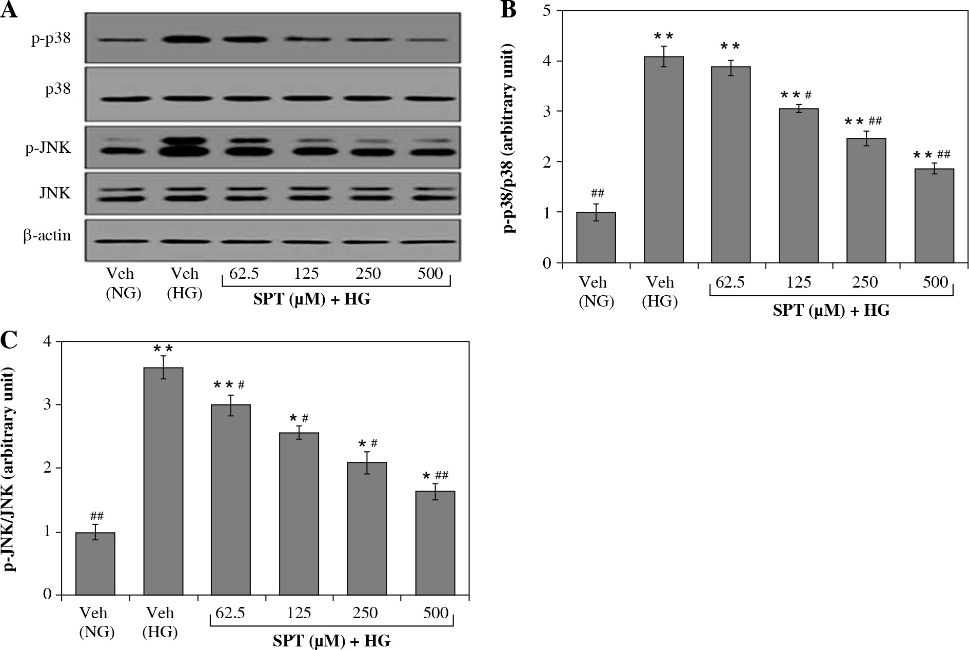 SPT lowered the p-p38/p38 and pJNK/JNK ratio in high glucose concentration cultured RGC-5 cells. A) Western blots for p-p38, p38, p-JNK, JNK and b-actin; B) The ratio of p-p38/p38 was calculated; C) The ratio of p-JNK/JNK was calculated. The results are presented as the mean ± SD of five independent experiments (n = 5), each of which was performed in triplicate. *p < 0.05 and **p < 0.01 when compared with the normal- glucose vehicle (Veh)-treated group. #p < 0.05 and ##p < 0.01 when compared with the high-glucose vehicle- treated group