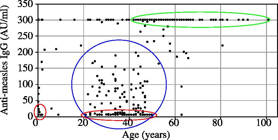 Distribution of IgG anti-measles antibodies according to patient’s age. Red circles show the population with seronegativity, the green circle shows the group with the highest level of immunization, and the blue group showed the highest diversity