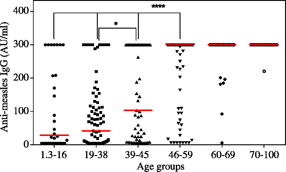 There was a significant difference in anti-measles IgG concentration between men and women, indicating that men have a lower level of specific anti-measles antibodies (median values 145.5 vs. 300 AU/ml, p = 0.033). An age dependence of antibody concentrations was observed (Fig. 1) and divided into three groups based on distribution: two with the lowest and one with the highest concentration of antibodies. The first group included patients with the lowest values in the 0-1 years old group. The second group included 20-45 years old patients, and the third group included patients older than 45 years, in which anti-measles IgG concentrations reached the highest values (Fig. 1). Individuals aged 20-45 had the most diversified distribution of results.