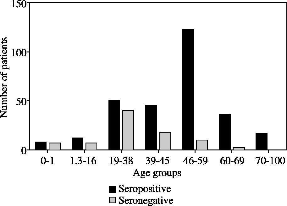 A significantly higher number of seronegative patients were in the male group than in the women group (p = 0.04). The studied groups differed significantly in measles-specific IgG values, which are presented in Table 1 and Figure 2. There was also a significant difference in the seronegativity/seropositivity ratio between examined aged groups, with the lowest seropositivity ratio in the group of subjects that were 19-38 years old (Fig. 3).