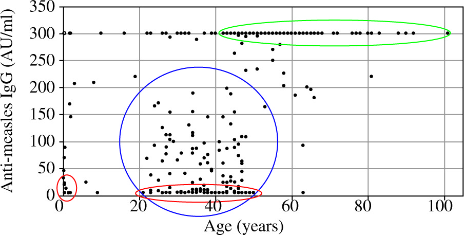 Distribution of IgG anti-measles antibodies according to patient’s age. Red circles show the population with seronegativity, the green circle shows the group with the highest level of immunization, and the blue group showed the highest diversity