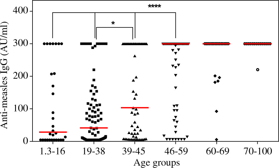 There was a significant difference in anti-measles IgG concentration between men and women, indicating that men have a lower level of specific anti-measles antibodies (median values 145.5 vs. 300 AU/ml, p = 0.033). An age dependence of antibody concentrations was observed (Fig. 1) and divided into three groups based on distribution: two with the lowest and one with the highest concentration of antibodies. The first group included patients with the lowest values in the 0-1 years old group. The second group included 20-45 years old patients, and the third group included patients older than 45 years, in which anti-measles IgG concentrations reached the highest values (Fig. 1). Individuals aged 20-45 had the most diversified distribution of results.