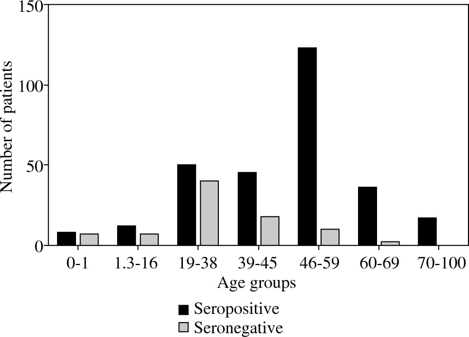 Data analysis was performed using GraphPad Prism v.6 (GraphPad Software, La Jolla, CA, USA). The type of data distribution was analyzed using the D’Agostino-Pearson omnibus normality test. The seroprevalence was analyzed using the modified Wald method. Differences between studied groups were evaluated using the Kruskal-Wallis test. The Mann-Whitney test was used to compare the serological status between men and women. The χ2 or Fischer exact tests were used to compare the seropositivity rates between different groups. A p-value less than 0.05 was considered statistically significant.