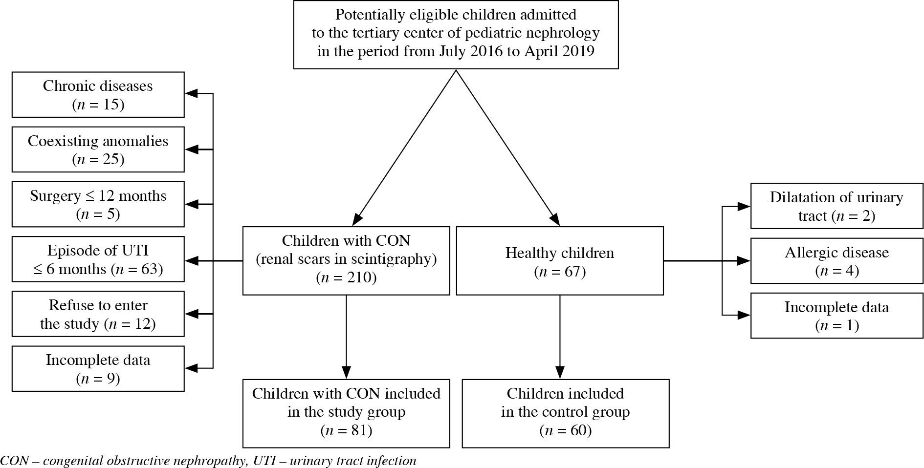 This cross-sectional single-center study was performed in 81 children with CON, who were treated in a tertiary pediatric nephrology center in Poland. The study was conducted between July 2016 and April 2019. The inclusion criteria were: age from 6 months to 18 years and presence of CON secondary to ureteropelvic junction obstruction (UPJO), ureterovesical junction obstruction (UVJO), and posterior urethral valves (PUV). The exclusion criteria were: the presence of chronic allergic, inflammatory, or fibrotic disease, coexisting anomalies of the urinary tract, except secondary vesicoureteral reflux (VUR) in children with PUV, surgical intervention in the last 12 months, urinary tract infection (UTI) in the last 6 months and acute infection (temporary exclusion). The control group consisted of 60 healthy children with normal results of blood and urine tests, and ultrasound (US) of the urinary tract, and no history of allergy. The flow diagram of the participants is displayed in Figure 1.