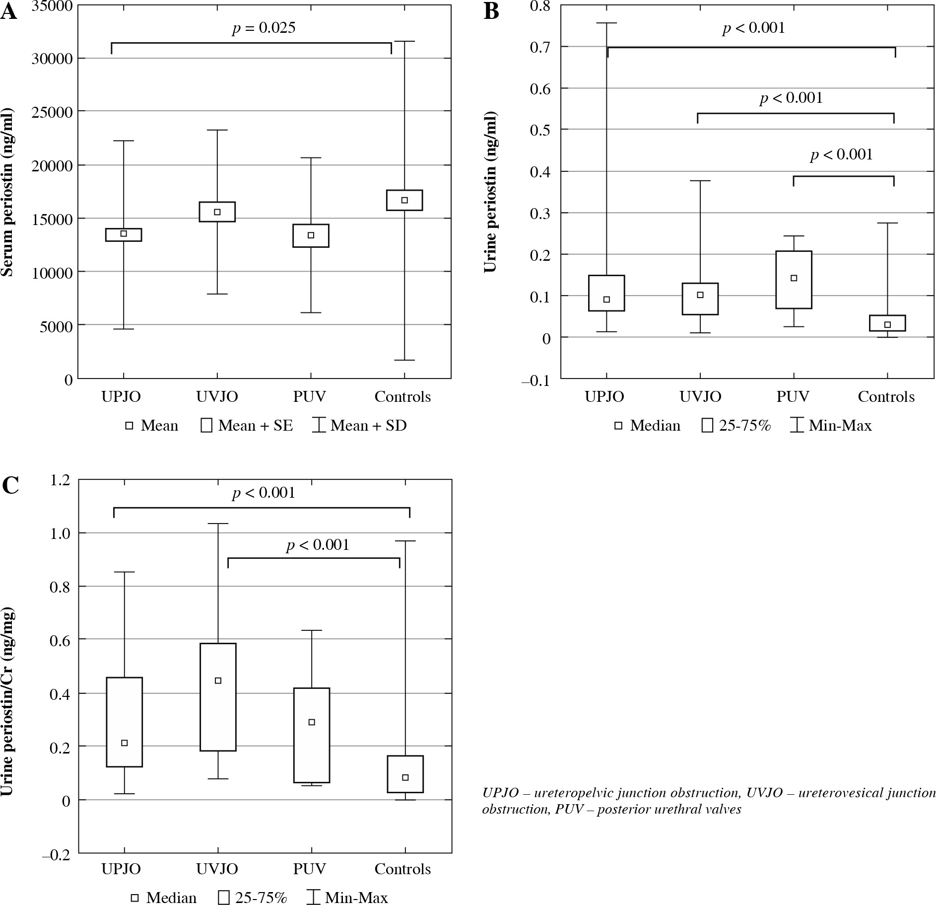 Comparison of biomarkers in children with UPJO, UVJO, PUV, and the controls: A) serum periostin, B) urine periostin, C) urine periostin/creatinine ratio