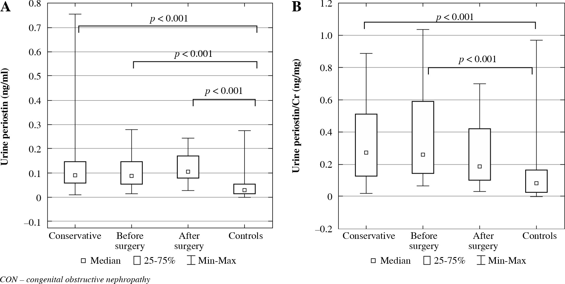 Children conservatively treated and those before and after surgery had significantly higher median uPeriostin and uPeriostin/Cr levels than the controls (Table 3). However, those after surgery had a significantly lower mean sPeriostin level than the controls. There were no other differences in biomarker levels between studied groups and the controls. The post hoc test confirmed significantly higher uPeriostin levels in all patients, regardless of CON treatment and significantly higher uPeriostin/Cr levels in children conservatively treated and before surgery compared to the controls (Fig. 3).