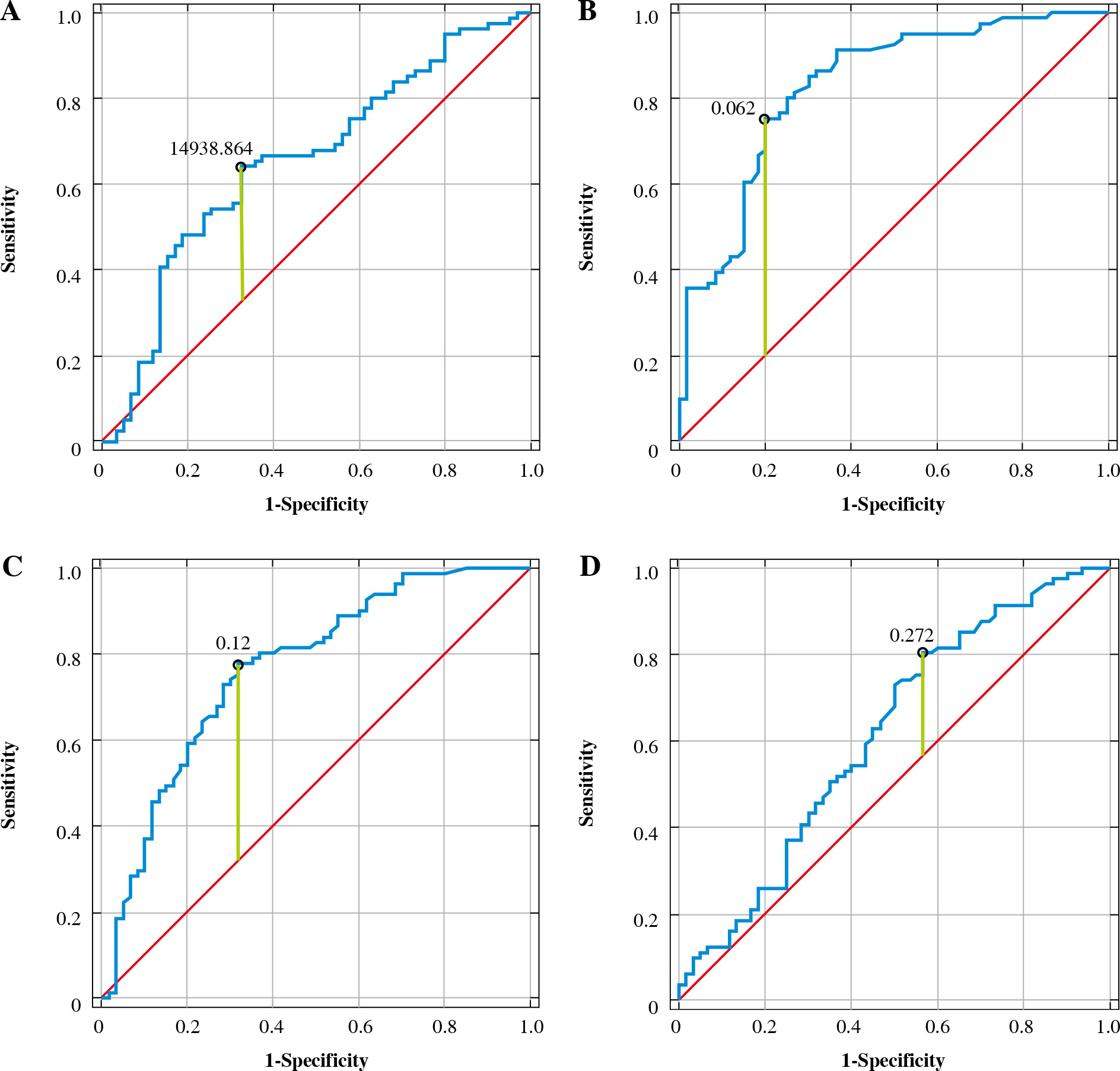 Diagnostic usefulness of biomarkers for detecting renal injury in children with obstructive nephropathy A) serum periostin (ng/ml), B) urine periostin (ng/ml), C) urine periostin/Cr (ng/mg), D) urine cytokeratin-18 (ng/ml)