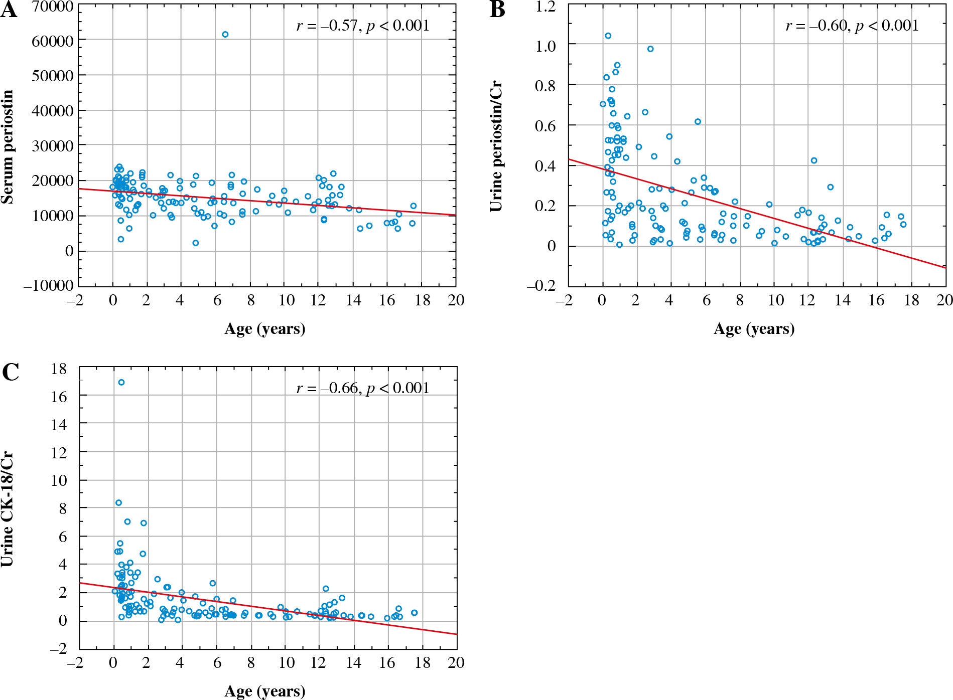 Serum and urine biomarkers demonstrated negative correlations with age. sPeriostin, uPeriostin/Cr and uCK-18/Cr revealed strong negative correlations with age in the study group (Fig. 5), and uPeriostin/Cr, sCK-18, and uCK-18/Cr showed weak negative correlations with age in the control group (r = –0.32, p = 0.014; r = –0.32, p = 0.011; r = –0.50, p < 0.001, respectively). We also found strong negative correlations of uPeriostin/Cr and uCK-18/Cr with uCr in the study group (r = –0.68, r = –0.93, respectively, p for all < 0.001) and the control group (r = –0.59, r = –0.68, respectively, p for all < 0.001).