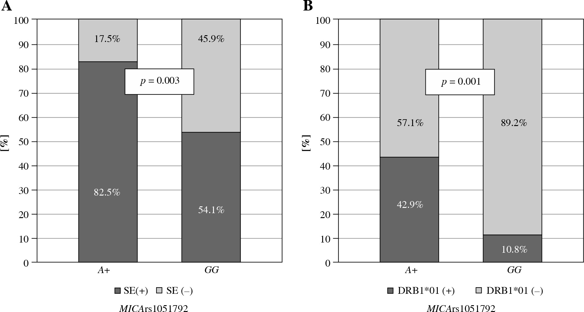 Relationship between MICA rs1051792 genotype and presence of HLA-DRB1 SE alleles in Polish RA patients. MICA A allele carriers were more likely to possess one of the HLA-DRB1 SE alleles, (A) especially HLA-DRB1*01:01 and/or DRB1*01:02 (B)