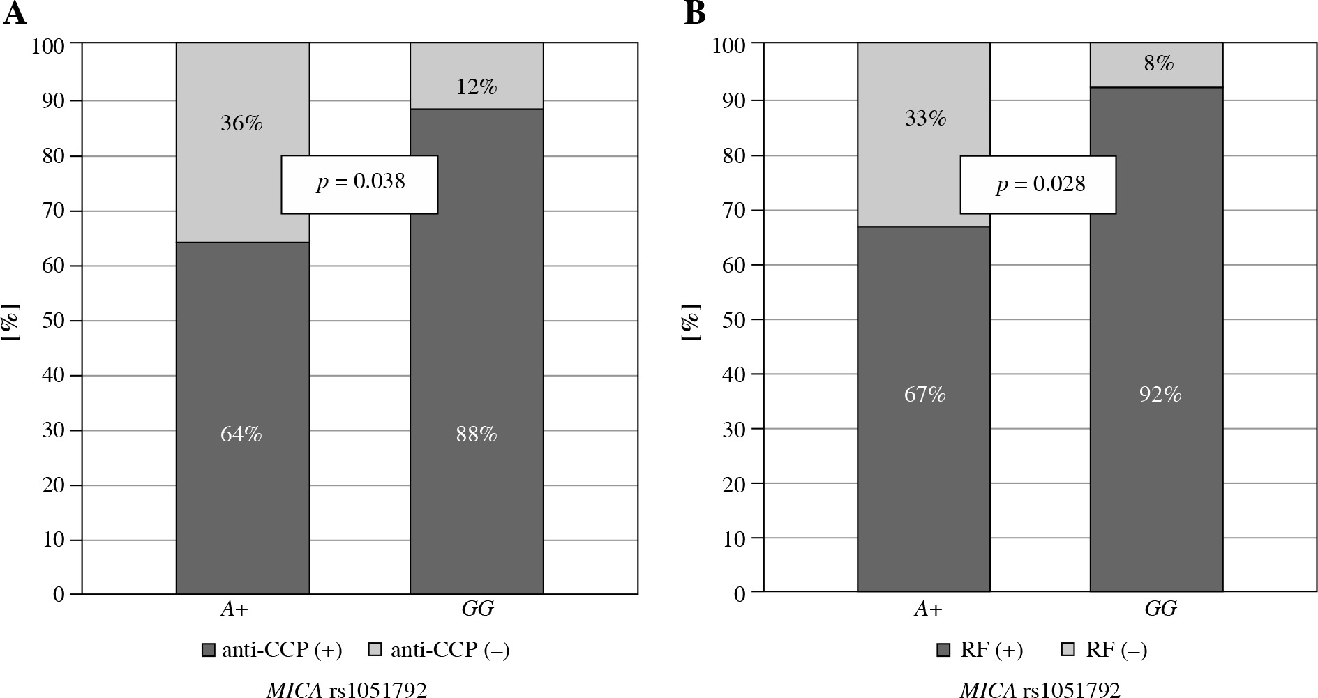 Relationship between MICA rs1051792 genotype and clinical parameters in Greek RA patients. MICA GG homozygous patients more frequently presented with anti-CCP antibodies (A) and RF (B) as compared to those carrying the A variant