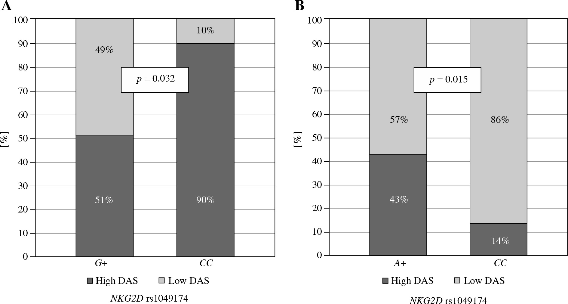 Relationship between disease activity score and NKG2D genotypes in Greek RA patients. Lower disease activity score characterised patients carrying the NKG2D rs1049174 G variant (A) or being NKG2D rs1154831 CC homozygotes (B)