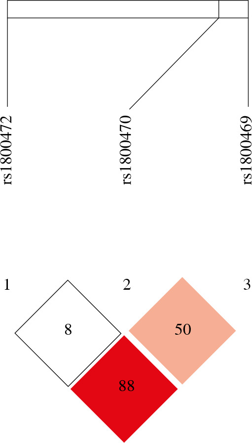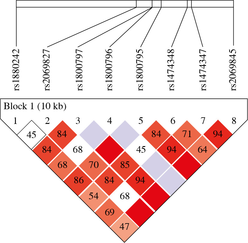 Linkage disequilibrium (LD) plot and SNPs of TGF-β1. The plot was generated using Haploview program with D’ color scheme (D’ = 0, 0)