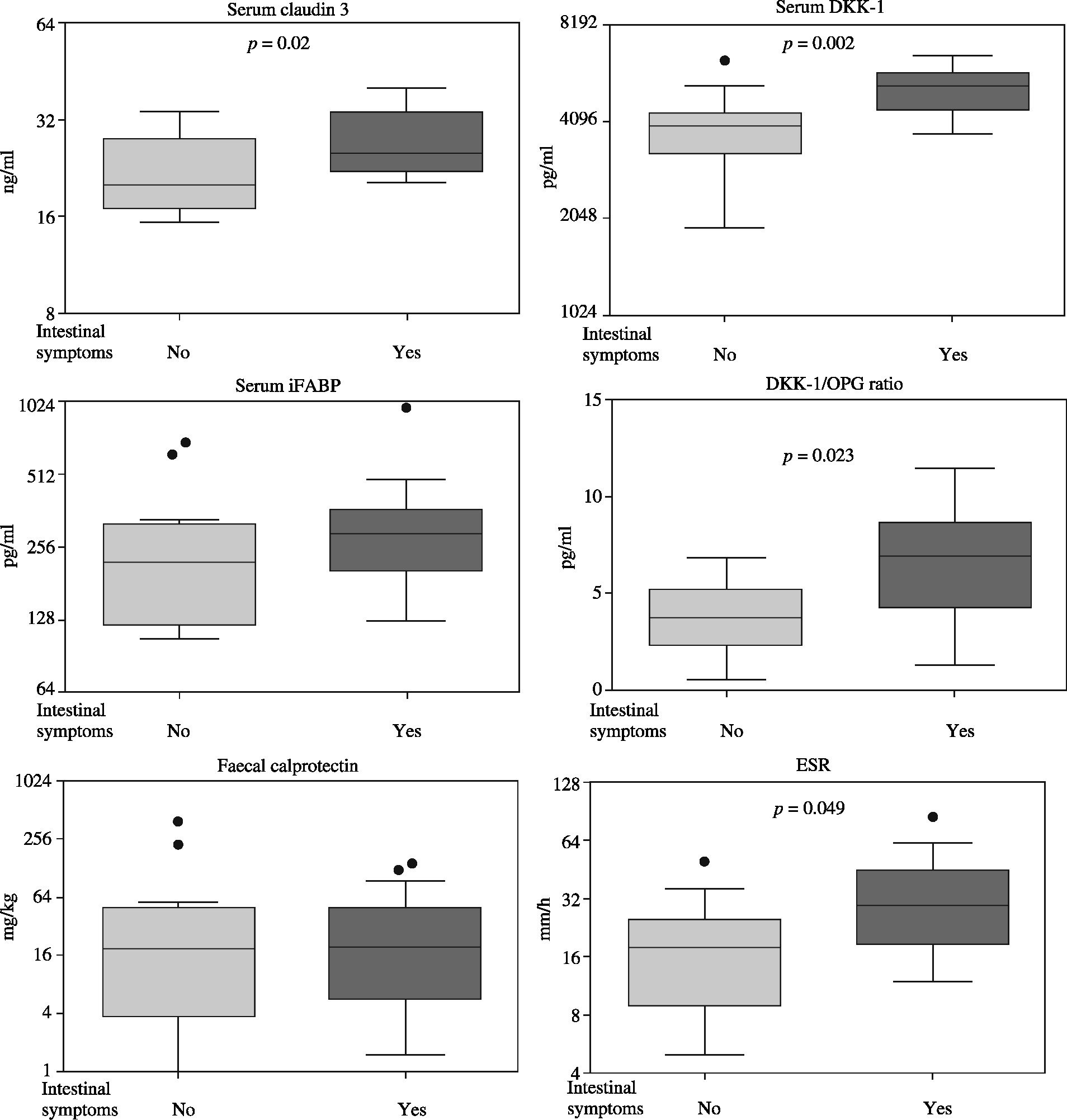 Comparison of spondyloarthritis patients with and without intestinal symptoms. Results are expressed as the median (horizontal line) with interquartile range (IQR, box), lower and upper whiskers (data within 3/2 × IQR), and outliers (points) (Tukey’s box). iFABP – intestinal fatty acid binding protein, DKK-1 – Dickkopf 1, OPG – osteoprotegerin, ESR – erythrocyte sedimentation rate. For statistically significant differences between patient groups p values are shown