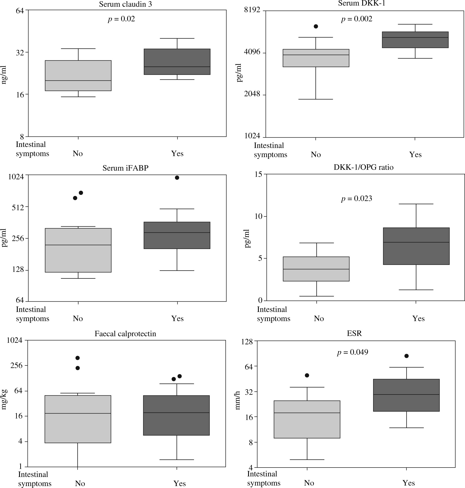 Comparison of spondyloarthritis patients with and without intestinal symptoms. Results are expressed as the median (horizontal line) with interquartile range (IQR, box), lower and upper whiskers (data within 3/2 × IQR), and outliers (points) (Tukey’s box). iFABP – intestinal fatty acid binding protein, DKK-1 – Dickkopf 1, OPG – osteoprotegerin, ESR – erythrocyte sedimentation rate. For statistically significant differences between patient groups p values are shown