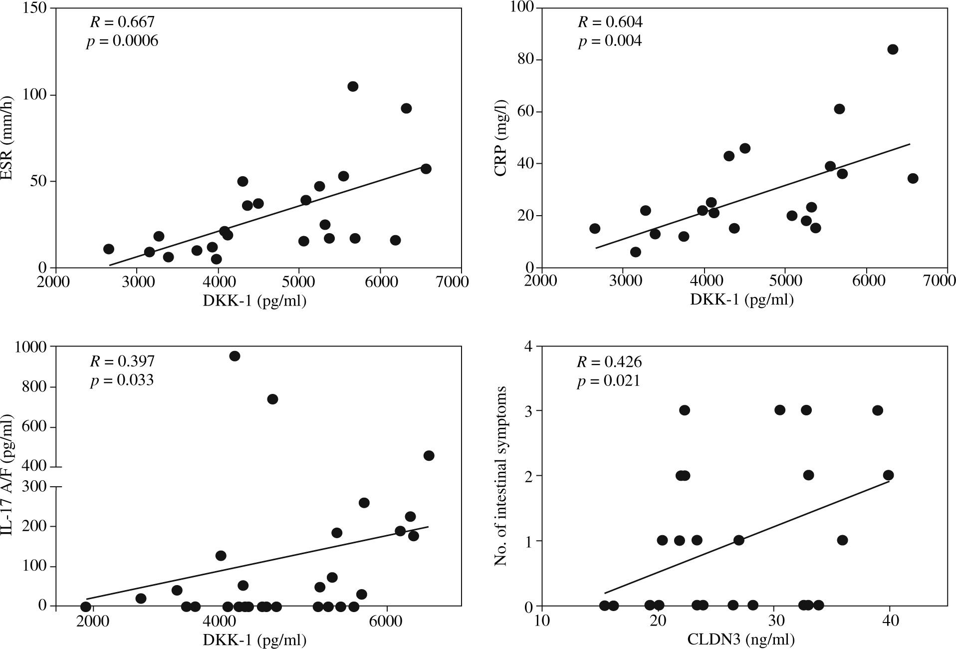 Relationship between the serum Dickkopf 1 (DKK-1) and claudin 3 (CLDN3) concentrations and clinical or laboratory data. Each point represents one patient. The correlation was assessed using Spearman’s rank test; R and p values are shown. Note that although Spearman’s rank correlations were performed, the regression lines were used for graphic purposes only. ESR – erythrocyte sedimentation rate, CRP – C-reactive protein, IL-17 A/F – interleukin 17 A/F