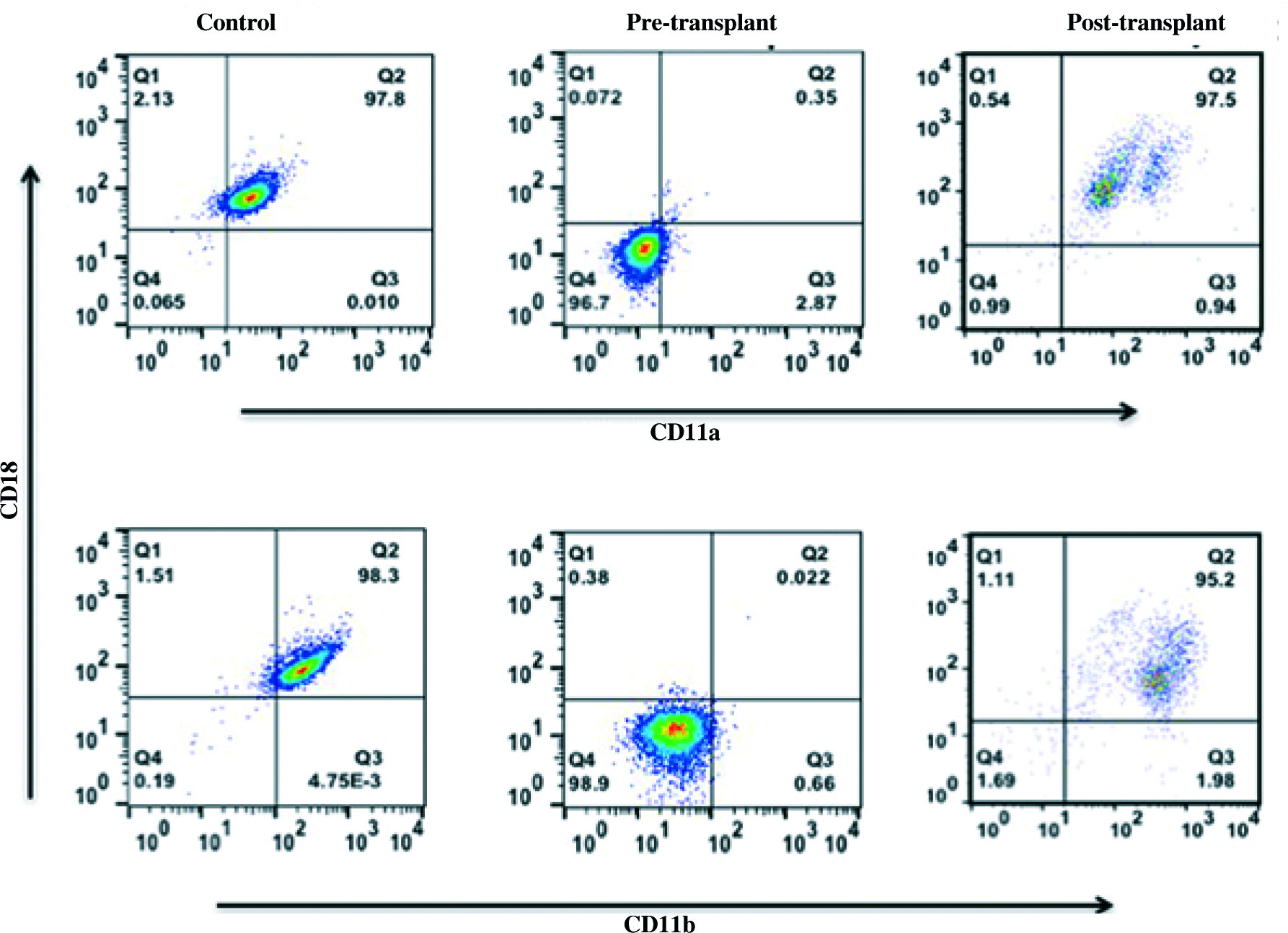 Expression of CD11a/CD18 and CD11b/CD18. Peripheral blood mononuclear cells were obtained from whole blood. Cells were stained ex vivo for surface markers, with fluorescently conjugated anti-CD18 PE and anti-CD11a FITC and CD11b PECy5. Samples were acquired with BD FACS Calibur and analyzed using FlowJo software v. 9.810.2. For data analysis, granulocytes were gated on Forward scatter and Side scatter, and cells were checked for the expression of CD11a/CD18 and CD11b/CD18