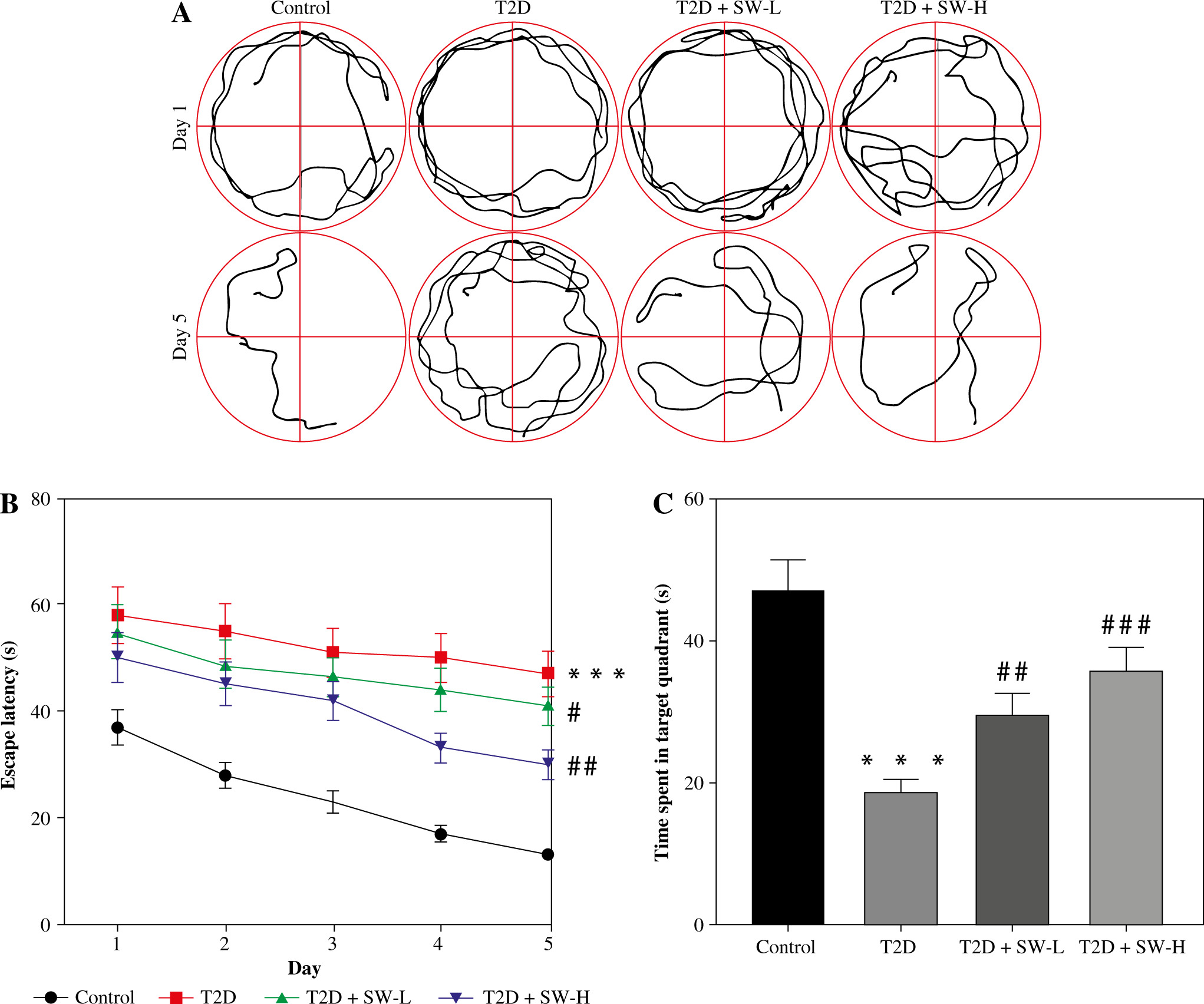 Type 2 diabetes is characterized by insulin resistance that causes glucose intolerance and hyperglycemia [20]. Mounting evidence has suggested that prolonged hyperglycemia is associated with morphological and functional changes in the central nervous system [21]. Chronic hyperglycemia induces persistent glucotoxicity in the brain and leads to severe neuropathologic changes such as neurodegeneration, neuroinflammation, and cognitive dysfunction [7]. STZ is a glucosamine derivative of nitrosourea and has been widely used in T2D induction in animal models. Here, we established a rat T2D model by HF diet feeding and STZ injection. Consistent with previous evidence, our results showed that T2D rats exhibited impaired spatial learning and memory abilities. However, SW treatment dose-dependently improved T2D-induced cognitive dysfunction in rats. Moreover, previous reports have indicated that SW possesses anti-hyperglycemic activity in STZ-induced T2D rats [11]. Moreover, Xu et al. proposed the ameliorative effect of SW on glucose intolerance and insulin resistance in HF diet-fed mice [12]. Similarly, in this study, SW administration induced a significant reduction in levels of fasting blood glucose and insulin in T2D rats, confirming its beneficial effects on glucose metabolism and insulin resistance in rats with T2D.