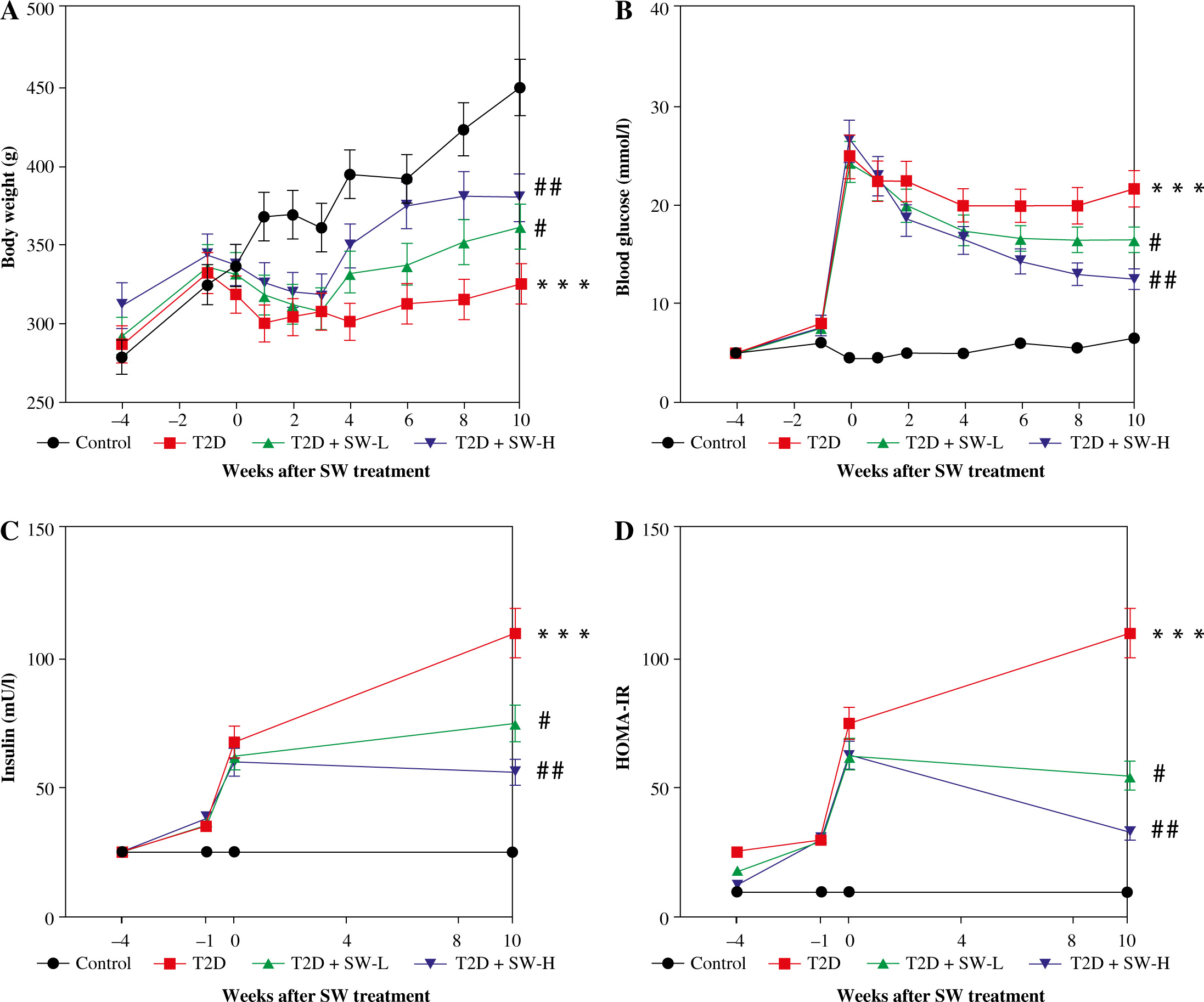 As shown in Figure 3A, STZ injection induced weight loss in T2D rats. However, the body weight of T2D rats continued to grow after the administration of SW, particularly SW-H (Fig. 3A). We estimated the blood glucose and insulin levels of rats. As the results showed, STZ injection dramatically elevated fasting blood glucose levels in rats, whereas SW treatment dose-dependently reduced blood glucose levels in T2D rats (Fig. 3B). In parallel, STZ injection enhanced plasma insulin level and HOMA-IR (Fig. 3C, D), confirming that the T2D model was successfully induced by HF diet feeding plus STZ injection. However, in T2D rats, SW administration remarkably reduced plasma insulin levels and HOMA-IR, with SW-H showing a more pronounced effect (Fig. 3C,D). These data suggested that SW could ameliorate hyperglycemia and insulin resistance in T2D rats.