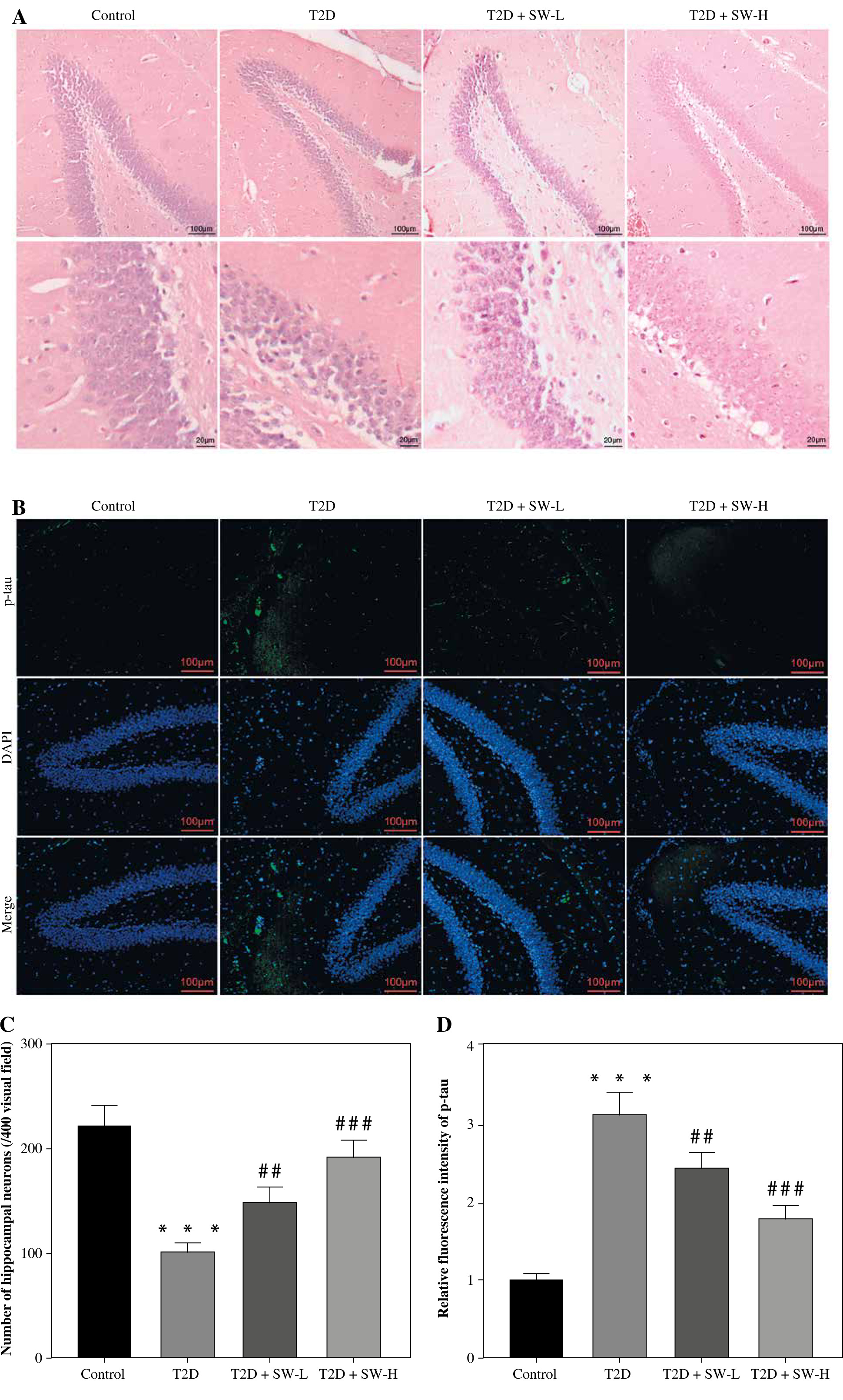 H&E staining was performed to examine whether SW affected hippocampal morphology in rats. The control group showed normal hippocampal morphology, with clear nuclear membranes and distinct nucleoli, while the T2D group exhibited significant loss of hippocampal neurons and sparse arrangement of hippocampal cells with blurred boundaries. However, these abnormalities were markedly abated after SW administration (Fig. 4A). Consistently, semi-quantitative analysis showed that the T2D + SW groups, especially the T2D + SW-H group, had more hippocampal neurons than the T2D group (Fig. 4C). Moreover, significant tau hyperphosphorylation was observed in the hippocampus of T2D rats in comparison to the control rats, whereas SW administration markedly reduced p-tau expression in T2D rat hippocampus, as shown by IF staining (Fig. 4B, 4D).