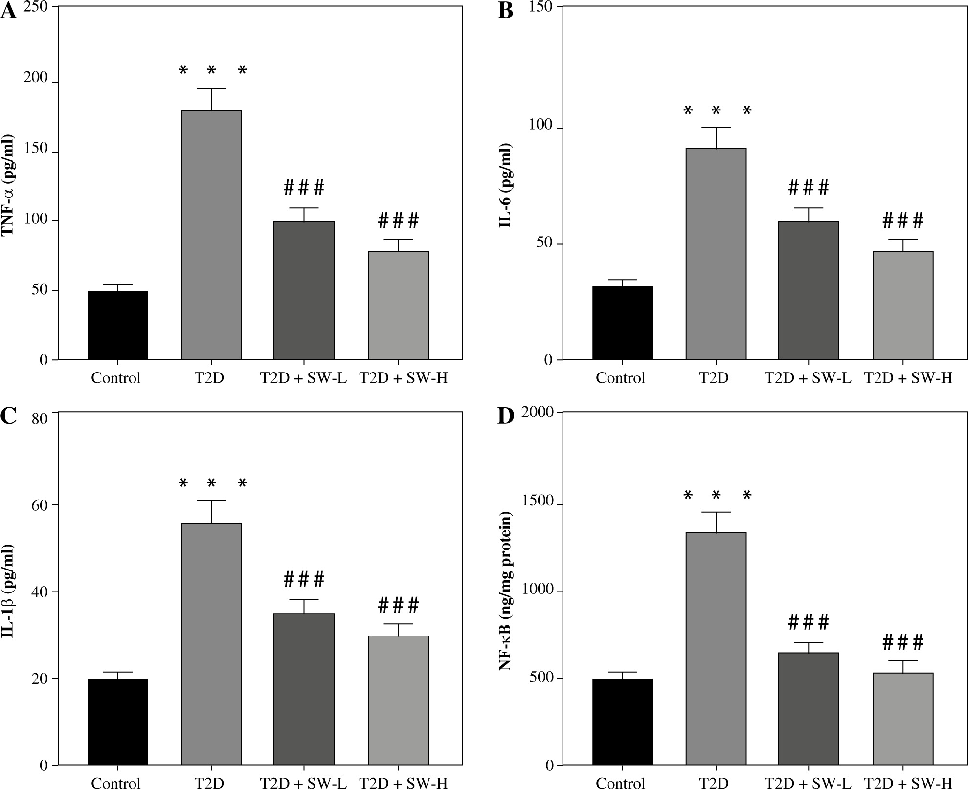 Subsequently, we estimated the SW effect on the production of inflammatory mediators in rat brain tissues. As expected, the levels of proinflammatory mediators, including TNF-α, IL-6, IL-1β, and NF-κB, in the T2D group were prominently higher than those in the control group (Fig. 5A-D), indicating that diabetes led to neuroinflammation in rats. Of note, SW treatment markedly counteracted the above effects in T2D rats (Fig. 5A-D), suggesting the anti-inflammatory effect on the hippocampus of T2D rats.