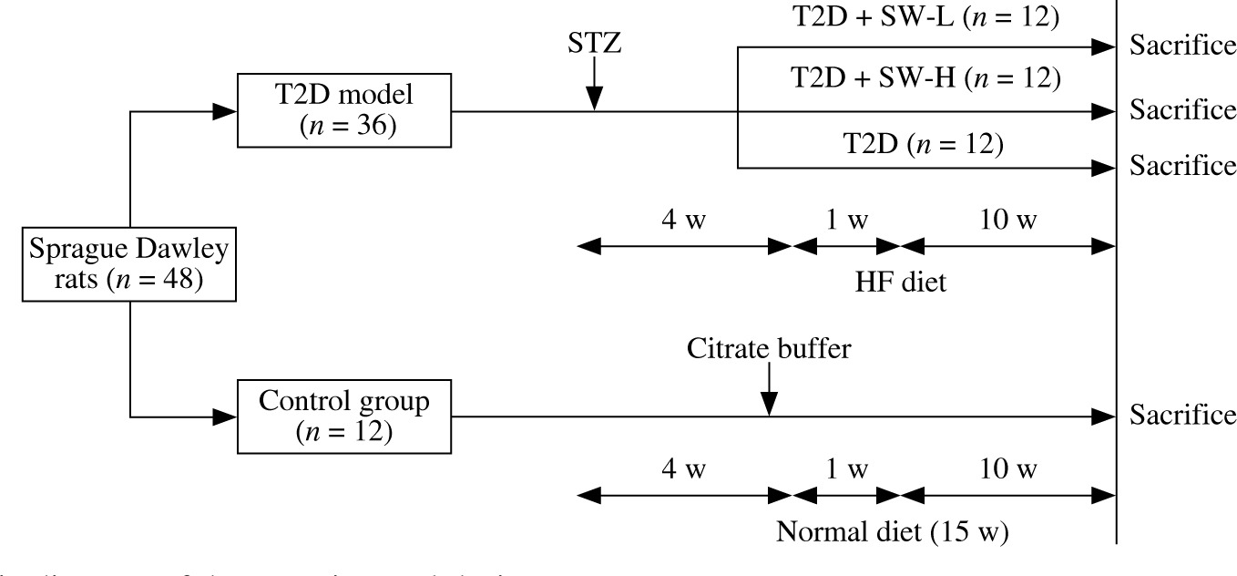 After one week of acclimatization, 48 SD rats were randomly assigned to the control group (n = 12) and T2D group (n = 36). To induce T2D, rats were fed with a high-fat (HF) diet (60% kcal fat; Trophic, Nantong, China) for 4 weeks and then received intraperitoneal injection of a single dose of STZ (35 mg/kg, dissolved in 0.1 M citrate buffer; MedChemExpress, Shanghai, China) after 12 h of fasting [18]. One week after STZ injection, animals with fasting blood glucose levels above 16 mM were confirmed diabetic. Then, the diabetic rats were further assigned to 3 groups (n = 12/group): the T2D group and T2D plus low-dose or high-dose SW (SW-L or SW-H) groups. In the T2D group, rats were fed with the HF diet for 10 weeks, and those in SW-treated groups were orally administered 25 mg/kg or 50 mg/kg SW (purity > 98%; MedChemExpress; dissolved in physiological saline) daily and fed with the HF diet for 10 weeks. SW was administered as a separate procedure from chow feeding. SW doses were determined based on previous reports [11, 19]. The control rats were fed with a normal diet for 15 weeks and received an injection of 0.1 M citrate buffer alone. Figure 1 shows a schematic diagram of the experimental procedure.
