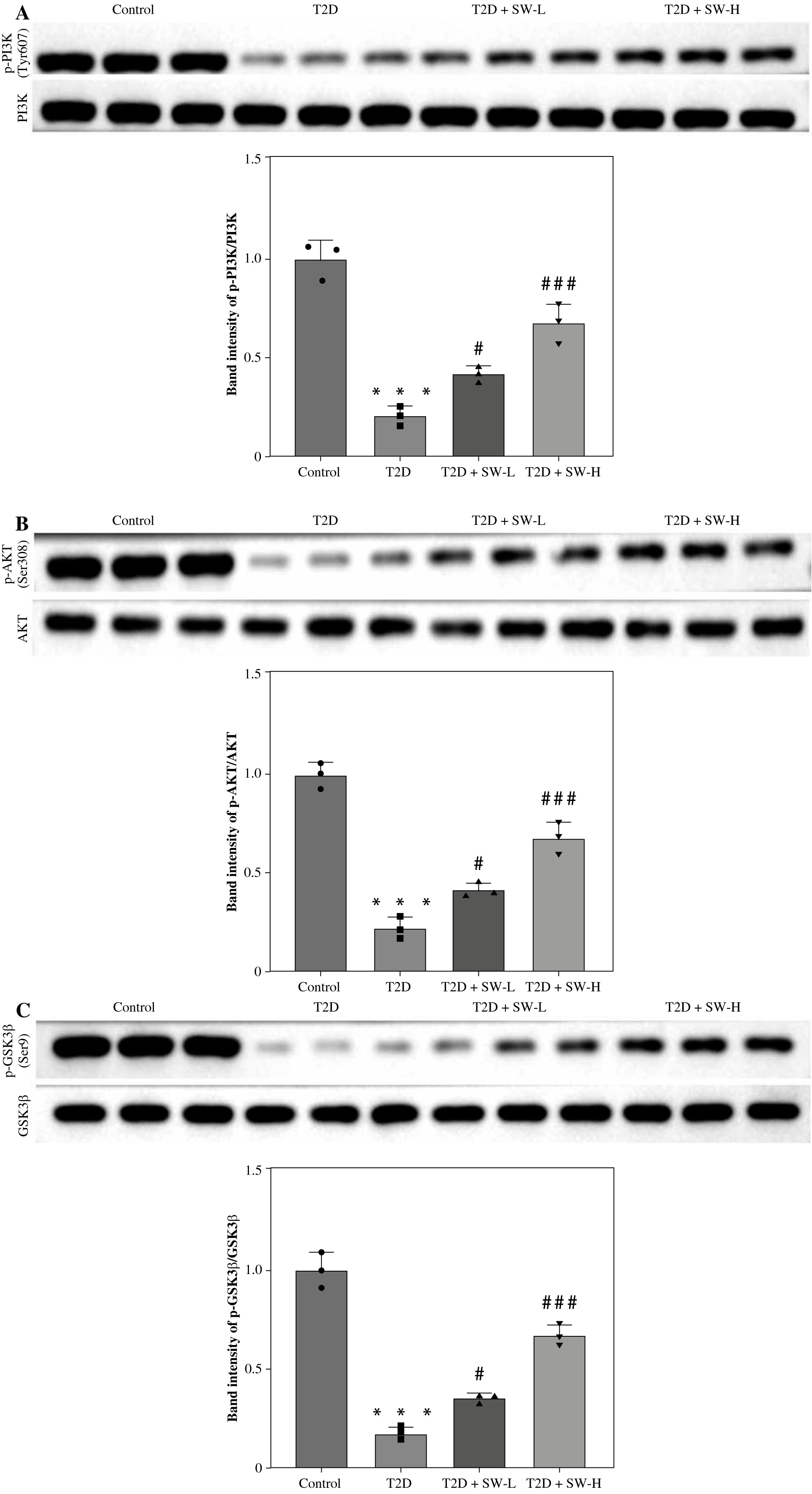 Swertiamarin (SW) activates PI3K/Akt/GSK3β signaling type 2 diabetes rat hippocampal tissues. A, B) Western blotting for detecting protein levels of p-PI3K and p-Akt in the rat hippocampus of each group. ***p < 0.001 vs. control group, #p < 0.05, ###p < 0.001 vs. T2D group. Swertiamarin (SW) activates PI3K/Akt/GSK3β signaling type 2 diabetes rat hippocampal tissues. C) Western blotting for detecting protein levels of p-GSK3β in the rat hippocampus of each group. ***p < 0.001 vs. control group, #p < 0.05, ###p < 0.001 vs. T2D group