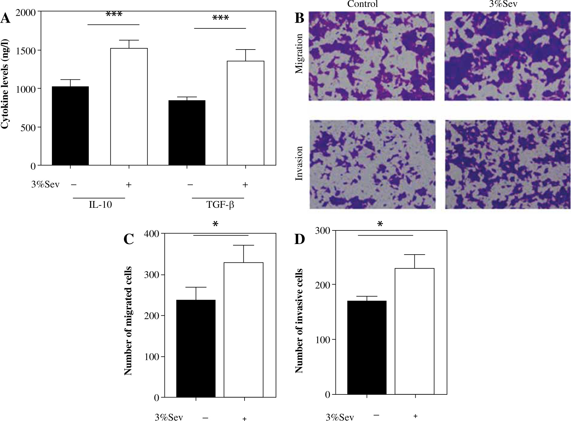 First, THP-1 cells were induced to M2 macrophages, with or without 3%Sev exposure. Twenty-four hours later, the cells were harvested and M2 markers were determined. Compared with the control THP-1, 3%Sev exposed THP-1 cells expressed more M2 markers IL-10 and TGF-β (Fig. 1A).