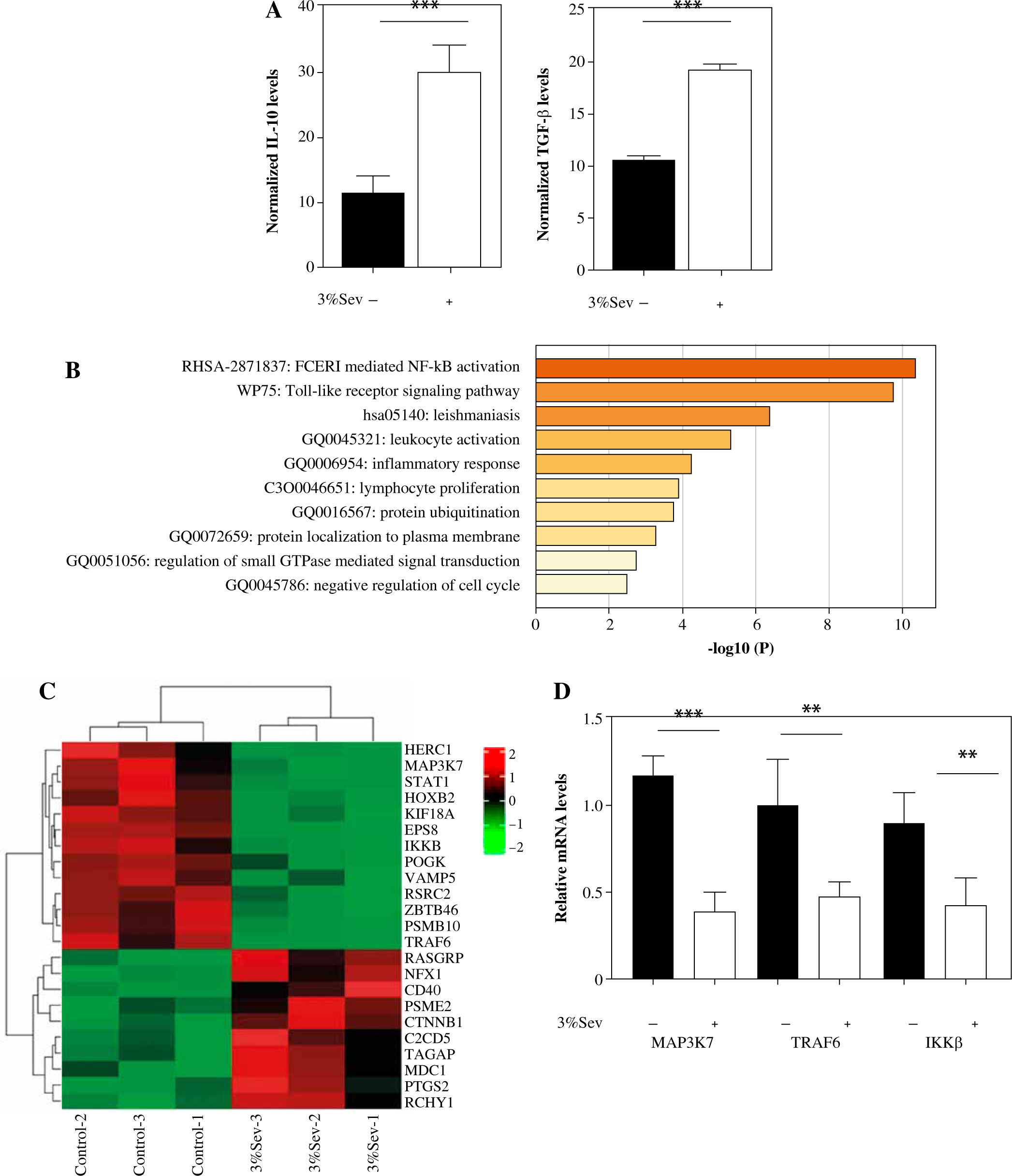 Next, we treated the M2 THP1 cells with or without 3%Sev, followed by RNA-seq to identify the differentially expressed transcripts. The RNA-seq results indicated that IL-10 and TGF-β transcripts were both enhanced by 3%Sev (Fig. 2A, B), which is in accordance with their protein expression trends (Fig. 1A). GO enrichment analysis of all the differentially expressed targets (including both down-regulated targets and up-regulated targets) was conducted by Metascape: we found that among the 3%Sev regulated targets, a series of targets were strongly involved in NF-κB activation (Fig. 2C). The heatmap in Figure 2D shows that the NF-κB pathway involved a cluster. Then, we tested several important targets by qRT-PCR, confirming that the key regulators of NF-κB signaling, such as TRAF6, MAP3K7 (TAK1) and IKKβ, were all decreased by 3%Sev exposure (Fig. 2E).